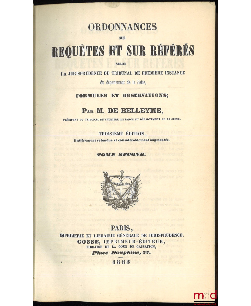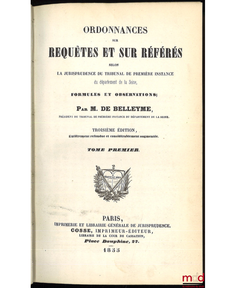 ORDONNANCES SUR REQUÊTES ET SUR RÉFÉRÉS SELON LA JURISPRUDENCE DU TRIBUNAL DE PREMIÈRE INSTANCE DU DÉPARTEMENT DE LA SEINE, FORMULES ET OBSERVATIONS, 3e éd. entièrement refondue et considérablement augmentée