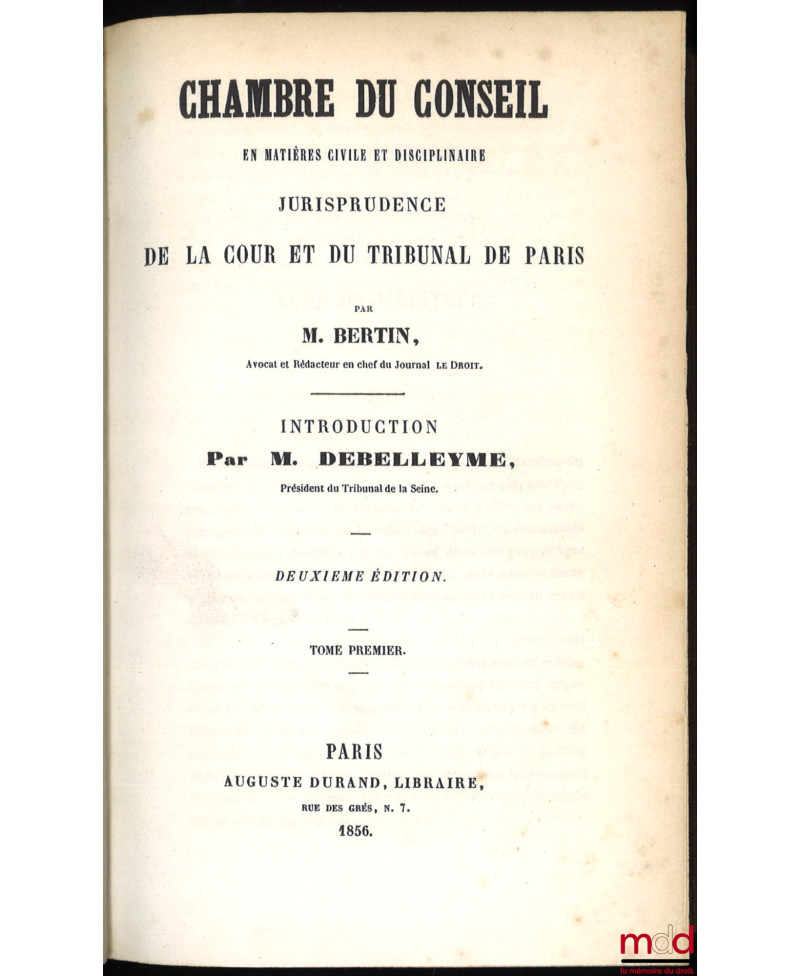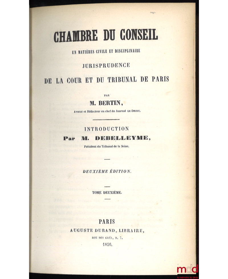 CHAMBRE DU CONSEIL EN MATIÈRE CIVILE ET DISCIPLINAIRE JURISPRUDENCE DE LA COUR ET DU TRIBUNAL DE PARIS, 2e éd., Introduction par M. Debelleyme