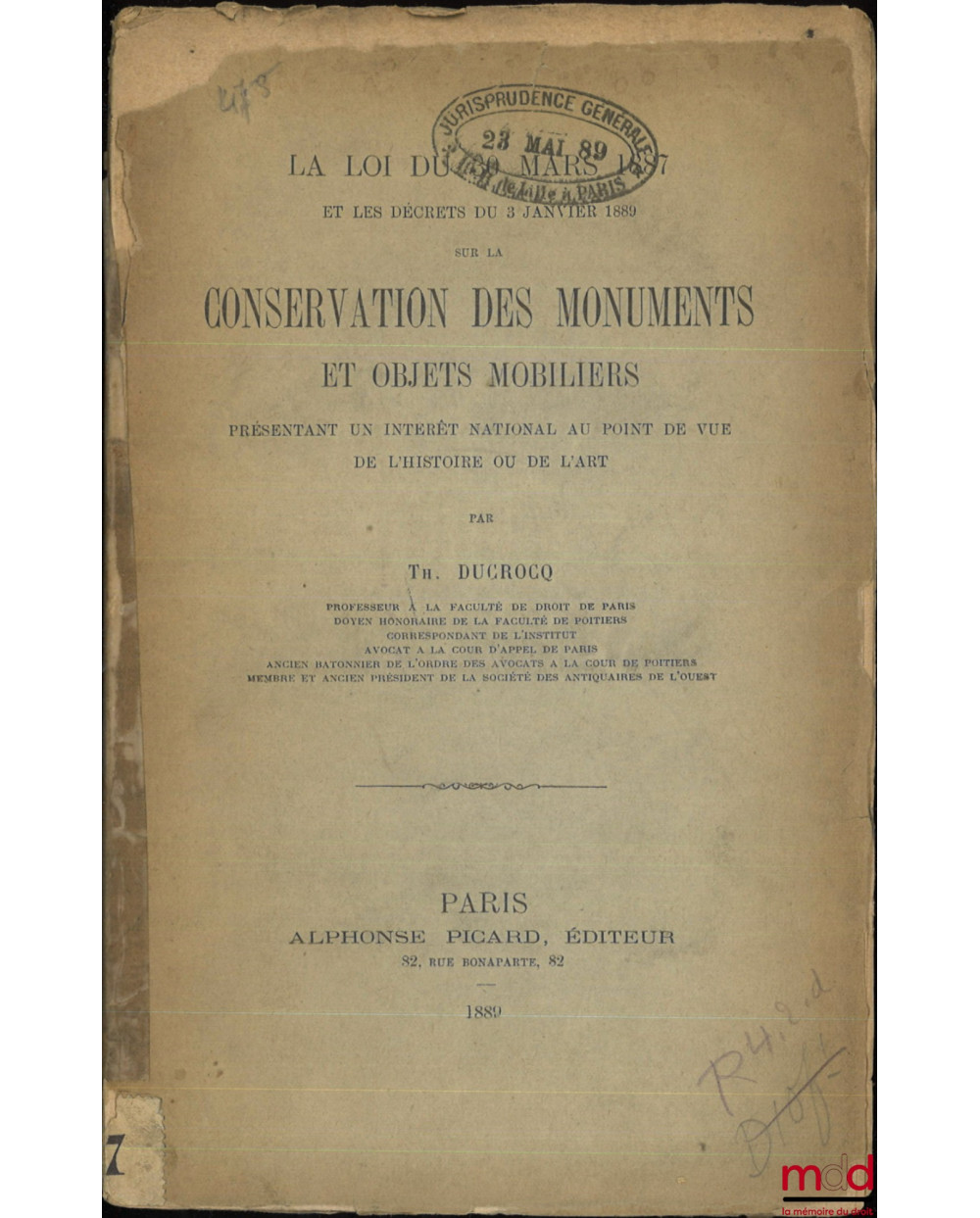 LA LOI DU 30 MARS 1887 ET LES DÉCRETS DU 3 JANVIER 1889 SUR LA CONSERVATION DES MONUMENTS ET OBJETS MOBILIERS PRÉSENTANT UN INTÉRÊT NATIONAL AU POINT DE VUE DE L’HISTOIRE OU DE L’ART