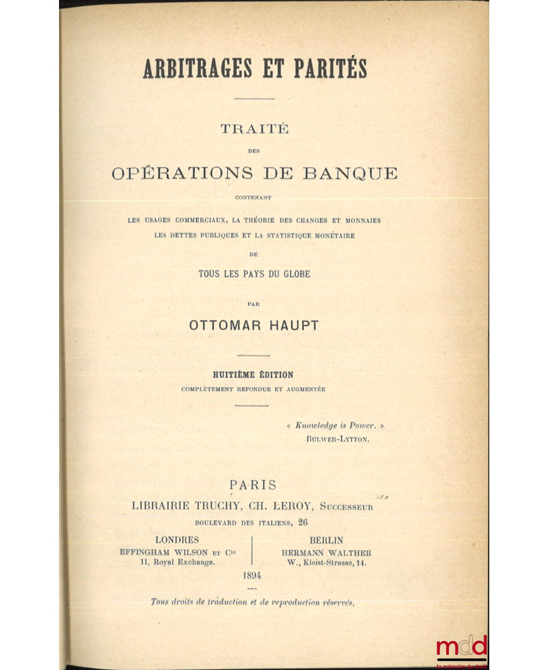 ARBITRAGES ET PARITÉS, TRAITÉ DES OPÉRATIONS DE BANQUE contenant les usages commerciaux, la théorie des changes et monnaies, les dettes publiques et la statistique monétaire de tous les pays du globe, 8e éd. complètement refondue et augmentée