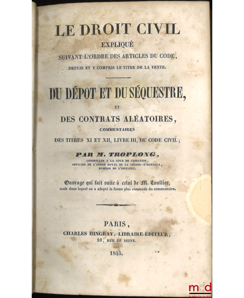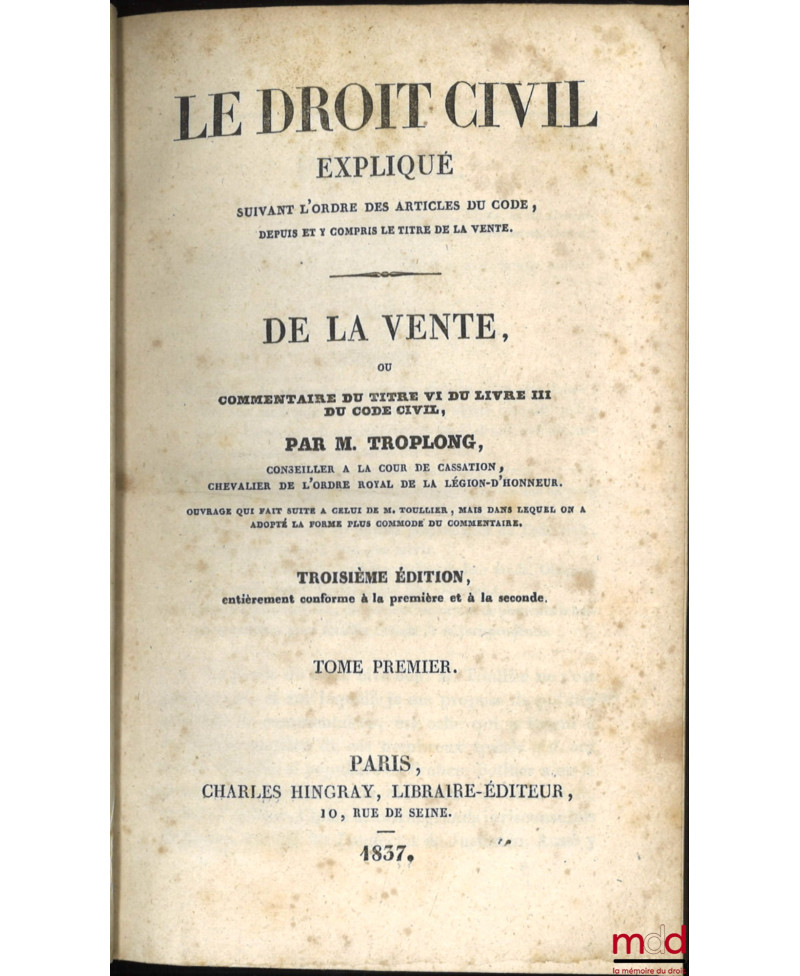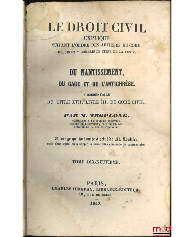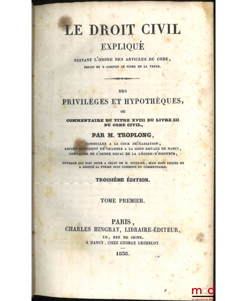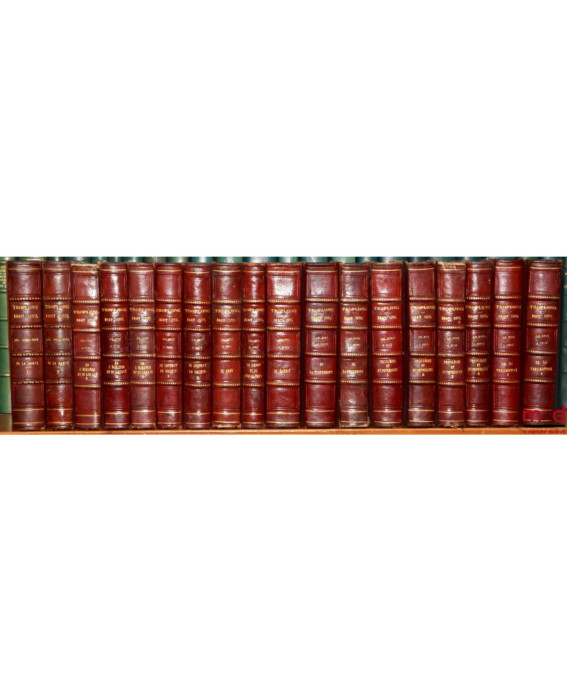 On ne reviendra pas sur la réhabilitation dont fait aujourd’hui l’objet l’œuvre de Troplong (v. catalogue 13). Evoquons plutôt ici la bibliographie de cet ensemble. Troplong se présenta au même titre que Duvergier comme le continuateur du traité que Toullier laissa inachevé à sa mort (il est à noter que Duvergier a de meilleurs droits que Troplong pour cela puisque c’était Toullier lui-même qui lui avait demandé de s’en charger !). Troplong se mit en outre au travail de manière désordonnée. Il publia en même temps les volumes consacrés à la vente, dans le prolongement immédiat de T., mais aussi ceux consacrés à la prescription, et donc concernant les derniers art. du Code. Il continua ensuite par les privilèges et hypothèques, puis le louage et l’échange, il termina, dans l’ordre, par les autres titres. Il est à noter que si les premiers vol. parurent en 1833, les nouvelles éditions se présentent elles mêmes comme "entièrement conformes aux précédentes". Cette première série fut achevée en 1856 avec le vol. sur "le commentaire de la loi du 23 mars 1855..". T. entreprit alors, dans une deuxième série, de reprendre la partie code qui avait été traitée par Toullier. Il donna ainsi les quatre vol. du "Contrat de mariage" (1851) et les 4 des "donations et testaments" (1855) mais mourut à son tour, avant d’avoir, et de loin, achevé son œuvre. Rare édition française complète et conservée ici en bon état.