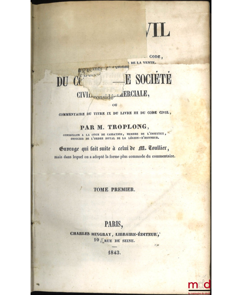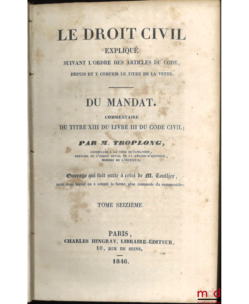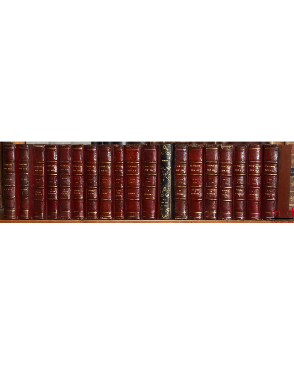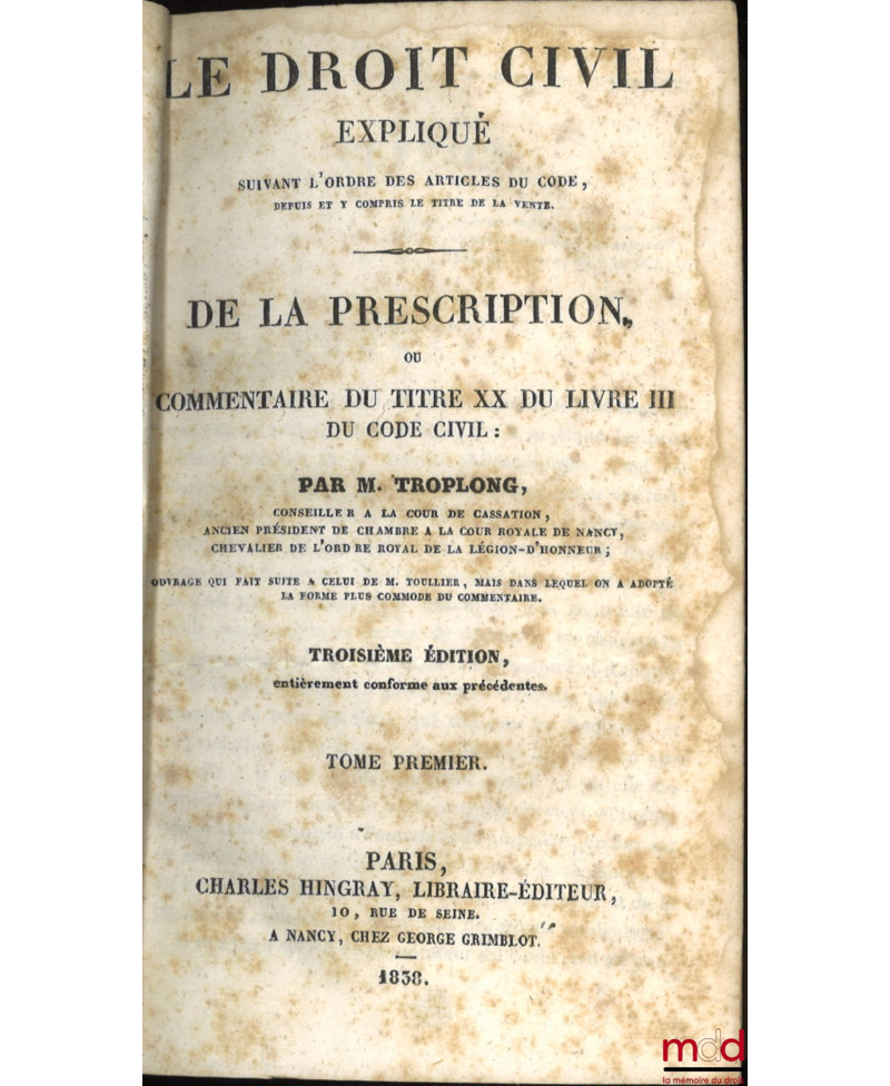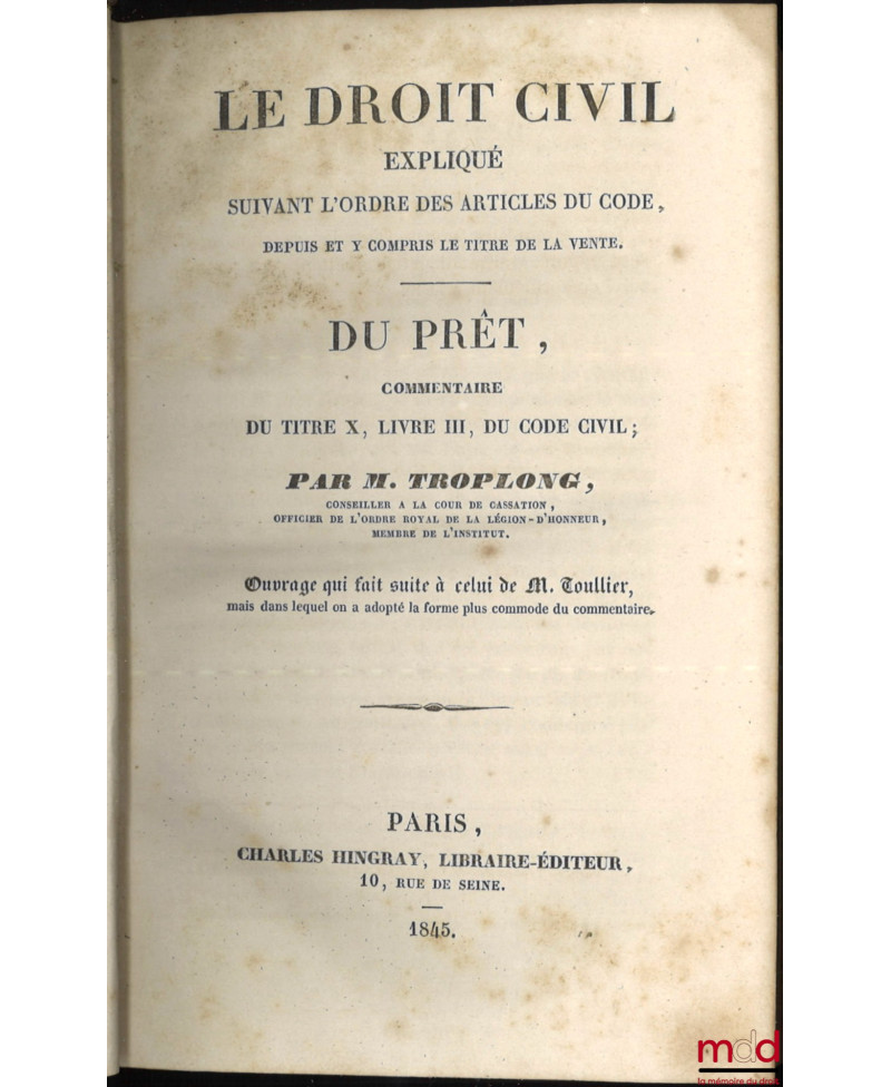 On ne reviendra pas sur la réhabilitation dont fait aujourd’hui l’objet l’œuvre de Troplong (v. catalogue 13). Evoquons plutôt ici la bibliographie de cet ensemble. Troplong se présenta au même titre que Duvergier comme le continuateur du traité que Toullier laissa inachevé à sa mort (il est à noter que Duvergier a de meilleurs droits que Troplong pour cela puisque c’était Toullier lui-même qui lui avait demandé de s’en charger !). Troplong se mit en outre au travail de manière désordonnée. Il publia en même temps les volumes consacrés à la vente, dans le prolongement immédiat de T., mais aussi ceux consacrés à la prescription, et donc concernant les derniers art. du Code. Il continua ensuite par les privilèges et hypothèques, puis le louage et l’échange, il termina, dans l’ordre, par les autres titres. Il est à noter que si les premiers vol. parurent en 1833, les nouvelles éditions se présentent elles mêmes comme "entièrement conformes aux précédentes". Cette première série fut achevée en 1856 avec le vol. sur "le commentaire de la loi du 23 mars 1855..". T. entreprit alors, dans une deuxième série, de reprendre la partie code qui avait été traitée par Toullier. Il donna ainsi les quatre vol. du "Contrat de mariage" (1851) et les 4 des "donations et testaments" (1855) mais mourut à son tour, avant d’avoir, et de loin, achevé son œuvre. Rare édition française complète et conservée ici en bon état.