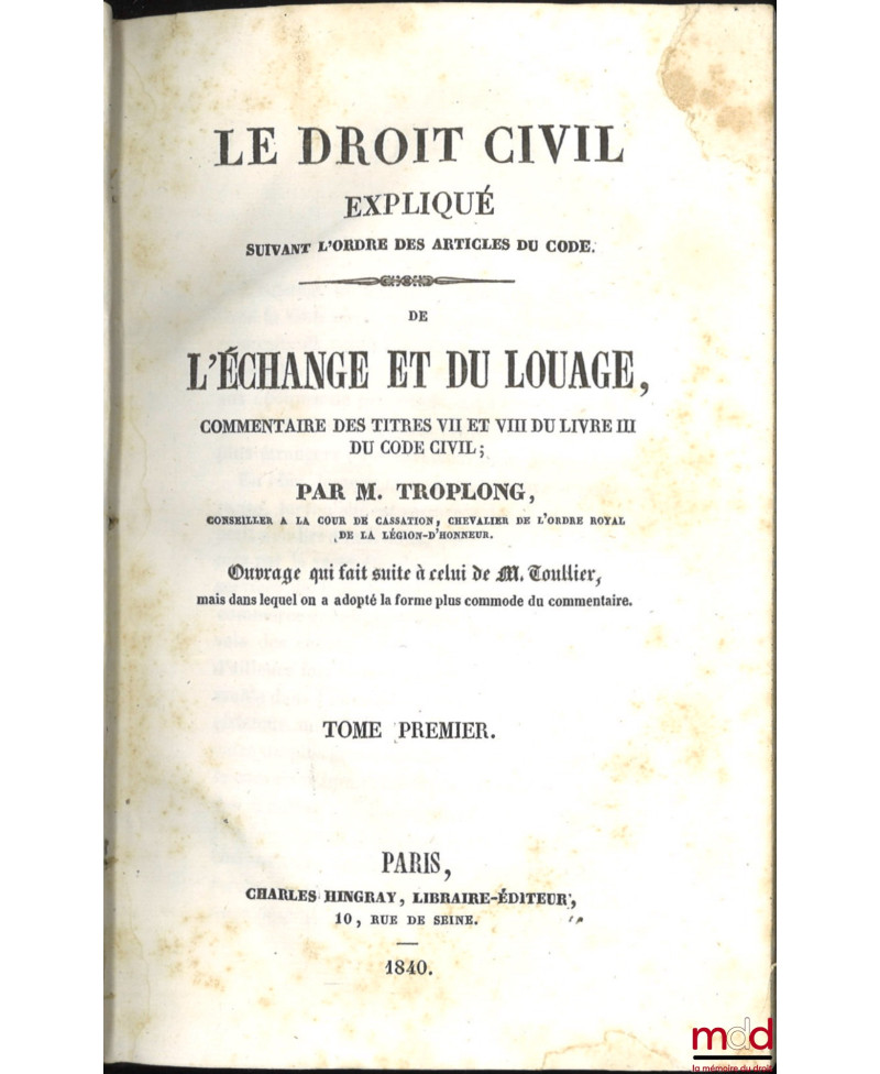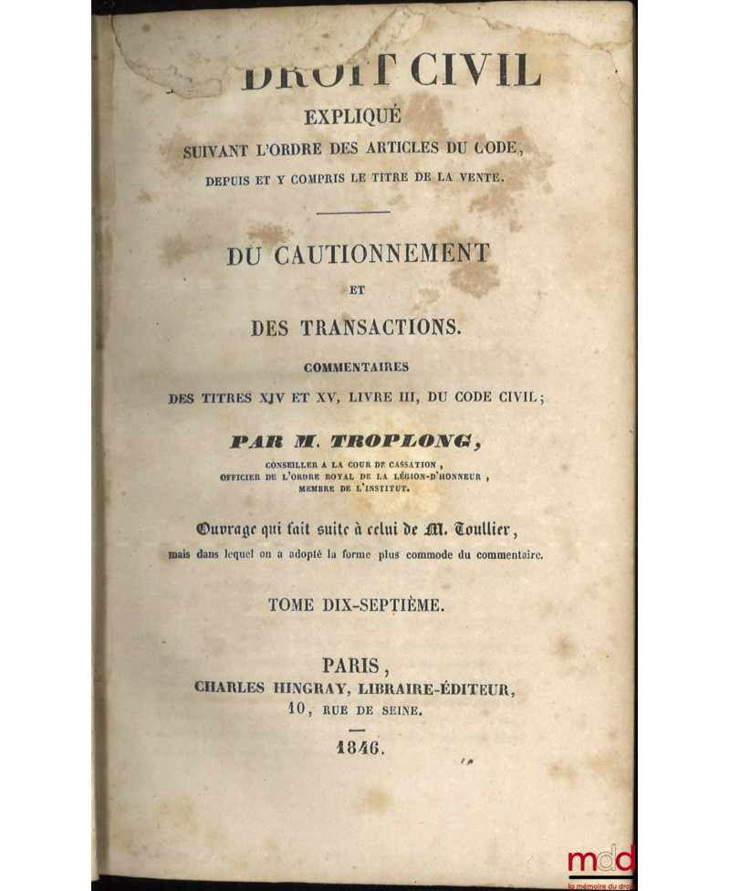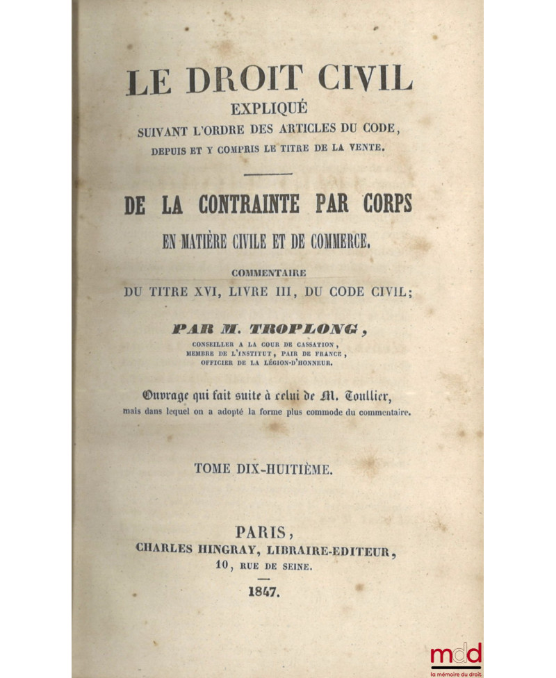 LE DROIT CIVIL EXPLIQUÉ SUIVANT L’ORDRE DES ARTICLES DU CODE DEPUIS ET Y COMPRIS LE TITRE DE LA VENTE, Ouvrage qui fait suite à celui de M. Toullier, mais dans lequel on a adopté la forme plus commode du commentaire :1re Série [complet]- DE LA VENTE, Ou commentaire du Titre VI du Livre III du Code civil, t. I et II, 3e éd. entièrement conforme à la première et à la seconde ;- DE L’ÉCHANGE ET DU LOUAGE, Commentaire des Titres VII et VIII du Livre III du Code civil, t. I, II et III ;- DU CONTRAT DE SOCIÉTÉ CIVILE ET COMMERCIALE, Commentaire du Titre IX du Livre III du Code civil, t. I et II ;- DU PRÊT, Commentaire du Titre X, Livre III du Code civil ;- DU DÉPÔT ET DU SÉQUESTRE ET DES CONTRATS ALÉATOIRES, Commentaire des Titres XI et XII, Livre III du Code civil ;- DU MANDAT, Commentaire du Titre XIII du Livre III du Code civil ;- DU CAUTIONNEMENT ET DES TRANSACTIONS, Commentaires des Titres XIV et XV, Livre III du Code civil ;- DE LA CONTRAINTE par corps en matière civile et de commerce, Commentaire du titre XVI, livre III du Code civil ;- DU NANTISSEMENT DU GAGE ET DE L’ANTICHRÈSE, Commentaire du Titre XVII, Livre III du Code civil ;- DES PRIVILÈGES ET HYPOTHÈQUES, Commentaire du Titre XVIII du Livre III du Code civil, t. I à IV, 3e éd. ;- DE LA PRESCRIPTION, Commentaire du Titre XX du Livre III du Code civil, t. I et II, 3e éd.
