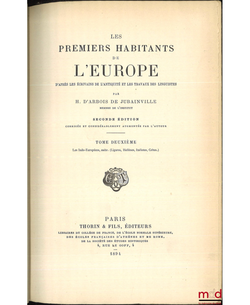LES PREMIERS HABITANTS DE L’EUROPE d’après les écrivains de l’Antiquité et les travaux des linguistes, 2nde éd. corrigée et considérablement augmentée par l’auteur, avec la collaboration de G. Dottin ; t. 1 : 1°) Peuples étrangers à la race indo-européenne (Habitants des cavernes, Ibères, Pélasges, Étrusques, Phéniciens), 2°) Indo-Européens, 1re partie (Scythes, Thraces, Illyriens, Ligures) ;t. 2 : Les Indo-Européens, suite. (Ligures, Hellènes, Italiotes, Celtes.)
