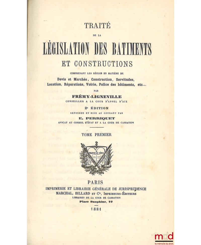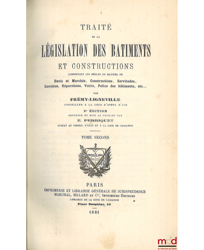 TRAITÉ DE LA LÉGISLATION DES BÂTIMENTS ET CONSTRUCTIONS, COMPRENANT LES RÈGLES EN MATIÈRE DE DEVIS ET MARCHÉS, CONSTRUCTIONS, SERVITUDES, LOCATION, RÉPARATIONS, VOIRIE, POLICE DES BÂTIMENTS, etc., 2e éd. refondue et mise au courant par E. P.
