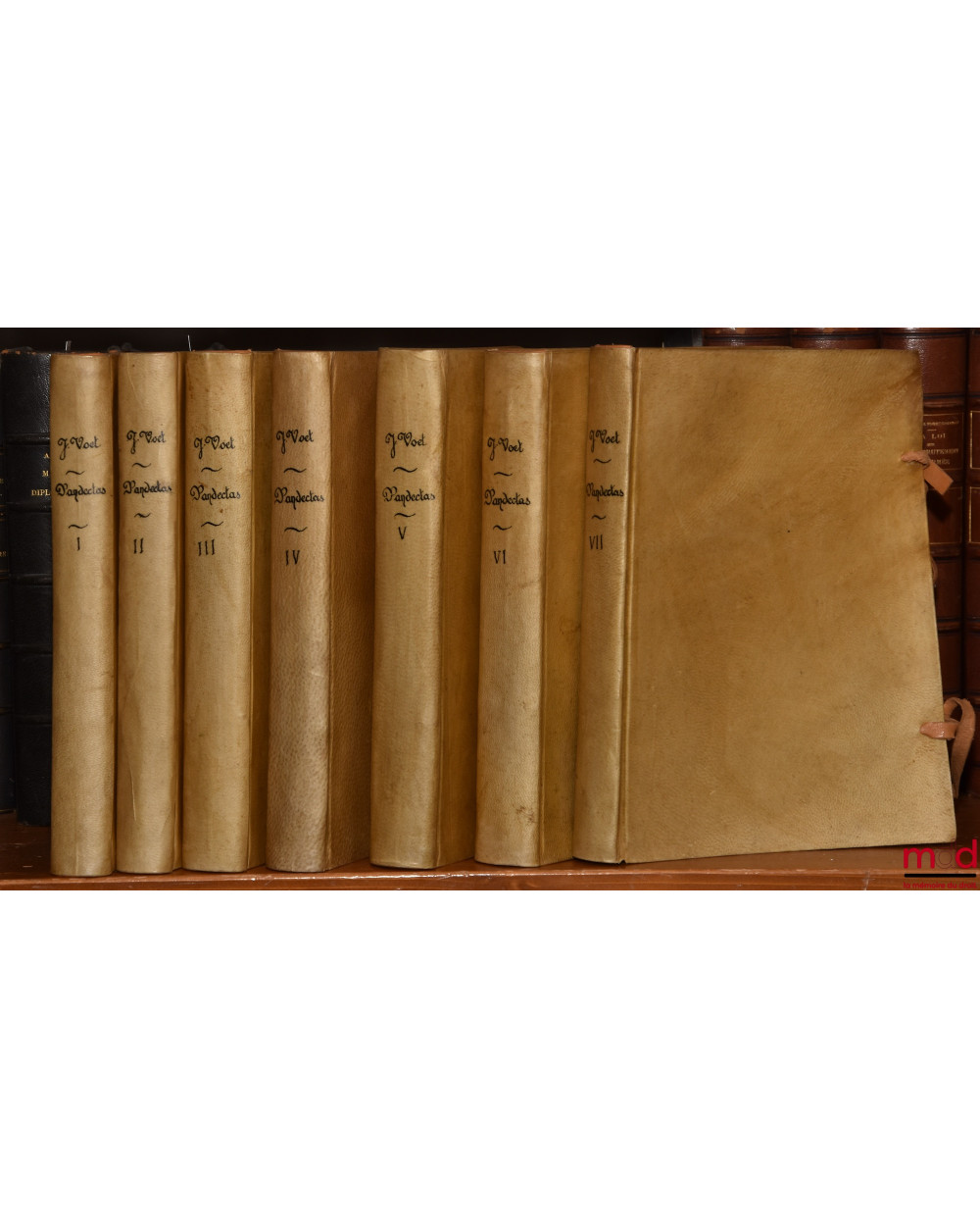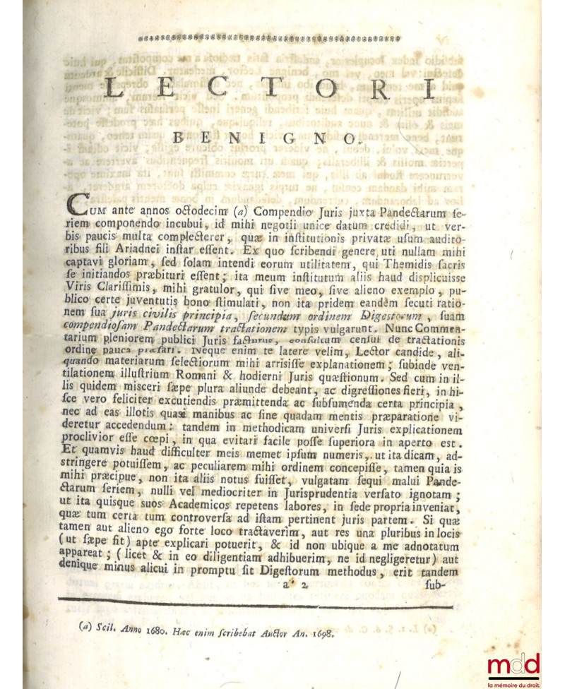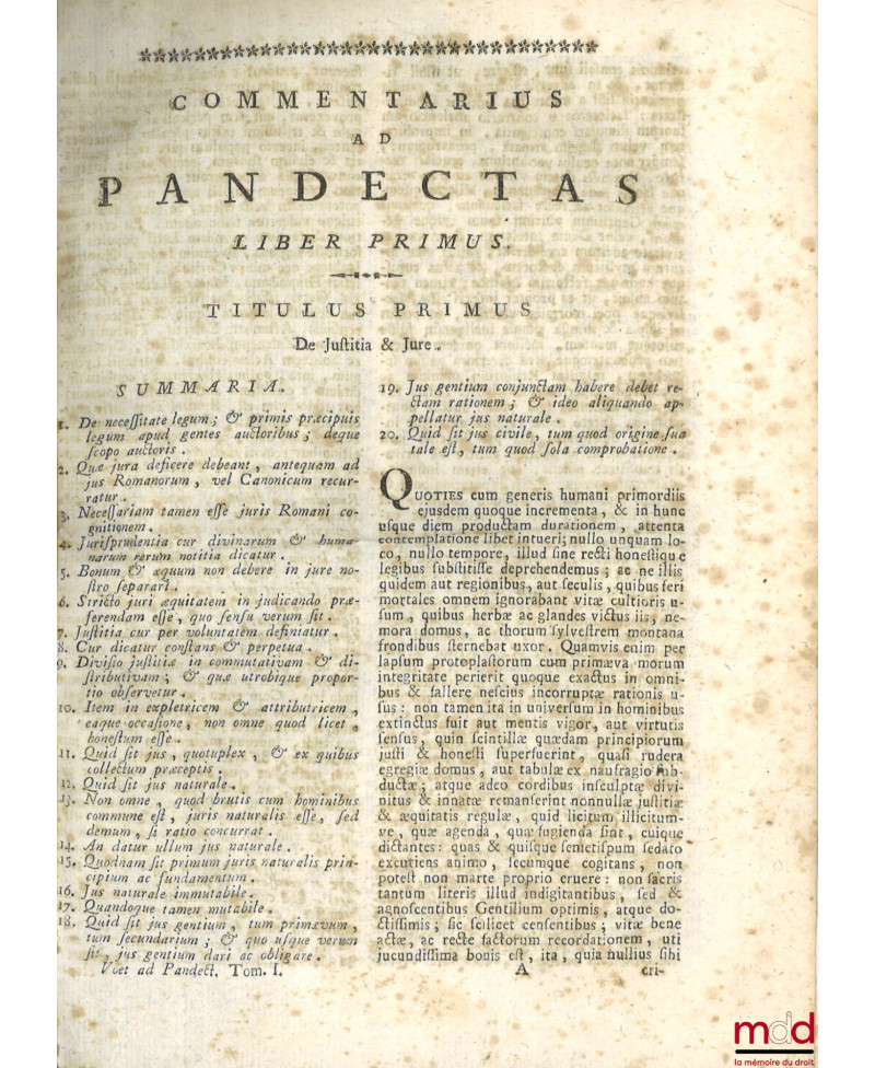 Une des œuvres les plus importantes du droit romain et un des plus grands commentaires des 50 Livres du Digeste publiés initialement à Amsterdam en 1698. « Bien qu'il montre des signes d’humanisme juridique, il peut également être considéré comme une forme néerlandaise d’usus modernus pandectarum. Traduit en allemand au XIXe siècle, il constitue encore aujourd’hui une source importante de la loi sud-africaine.Voët voulait réunir ensemble la théorie et la pratique des droits romain et moderne. Contrairement à l’humanisme juridique, il ambitionnait d’expliquer le droit et non de se livrer à une critique philologique des textes. Au lieu de problématiser la genèse du Corpus Juris Civilis, il l’acceptait fondamentalement comme simple texte légal.Selon Voët, la connaissance du droit coutumier suffisait à expliquer le droit et à être un bon juriste, alors que pour son confrère Gerhard Noodt, qui soumettait les textes du Corpus Juris à une critique philologique en examinant les interpolations possibles, la compréhension humaniste des textes s’arrêtait nécessairement à un enseignement historique et philologique. » Rare édition complète du dernier volume d’index.