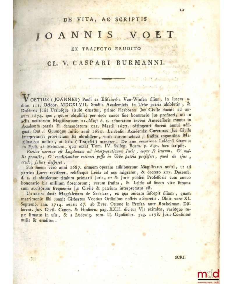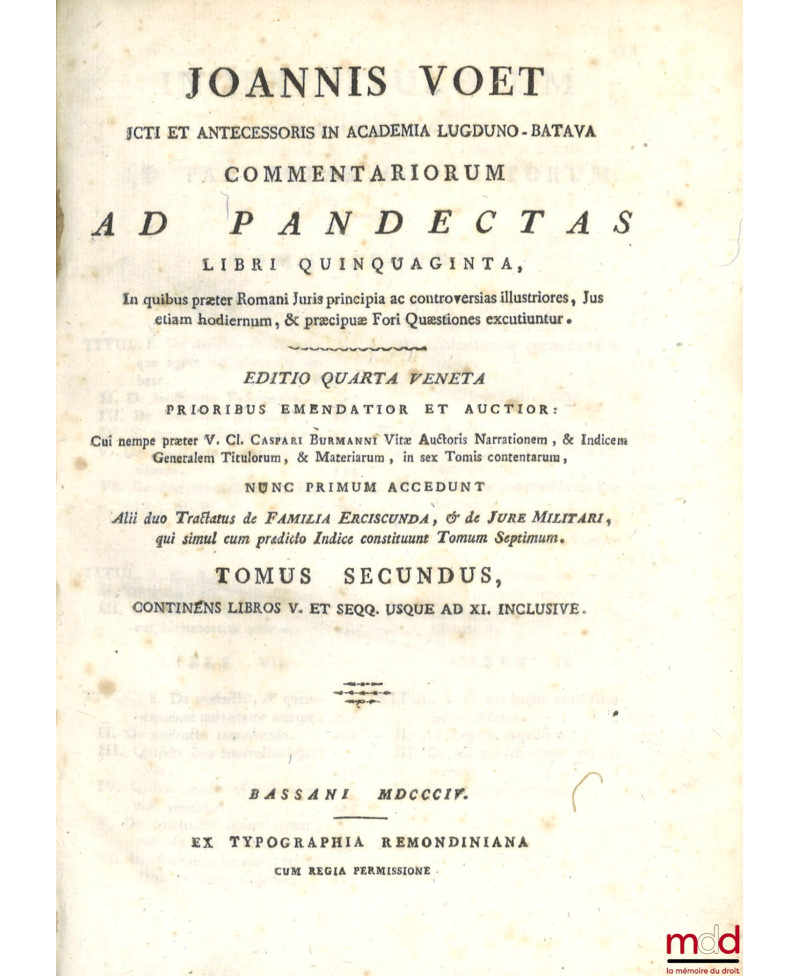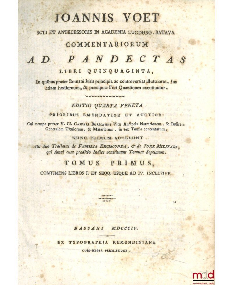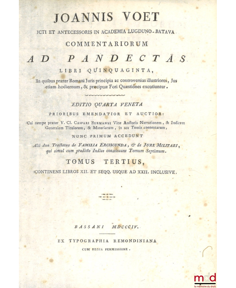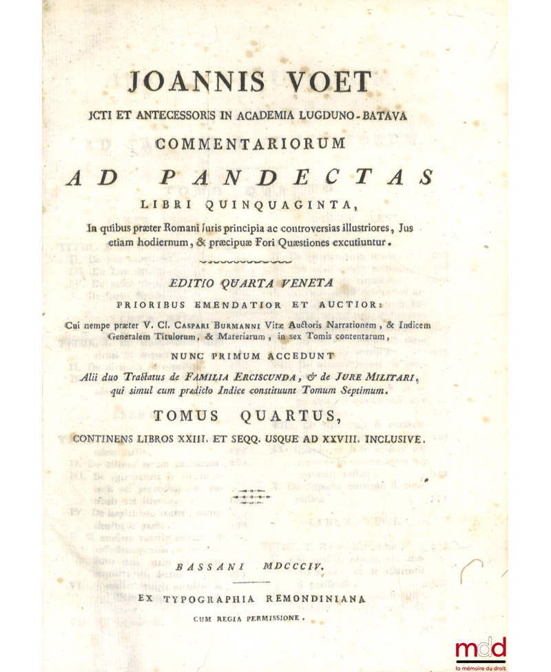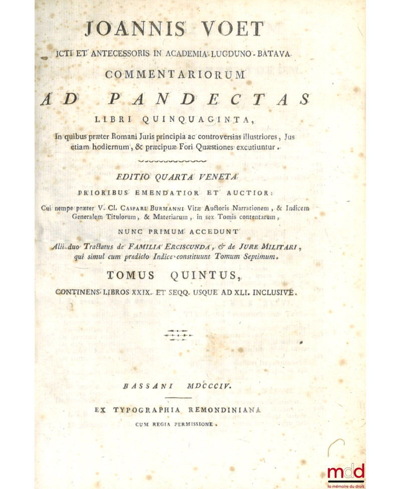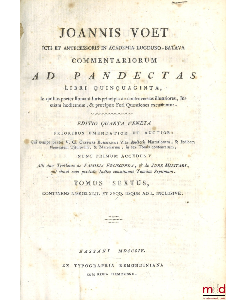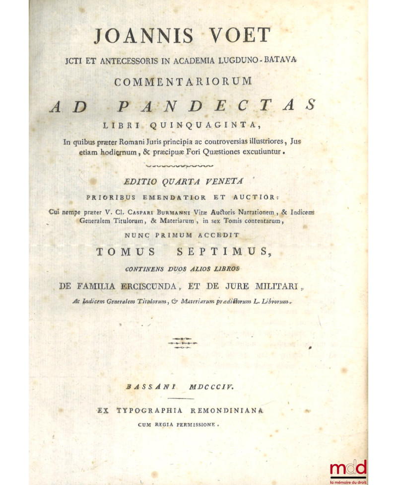 JOANNIS VOET JCTI ET ANTECESSORIS IN ACADEMIA LUGDUNO-BATAVA, COMMENTARIORUM AD PANDECTAS, LIBRI QUINQUAGINTA, In quibus præter Romani Juris principia ac controversias illustriores, Jus etiam hodiernum, & præcipuæ Fori Quæstiones excutiuntur. EDITIO QUARTA VENETA PRIORIBUS EMENDATIOR ET AUCTIOR : Cui nempe præter V. Cl. CASPARI BURMANNI Vitæ Auctoris Narrationem, & Indicem Generalem Titulorum, & Materiarum, in sex Tomis contentarum, NUNC PRIMUM ACCEDUNT, Alii duo Tractatus de FAMILIA ERCISCUNDA, & de JURE MILITARI, qui simul cum prædicto Indice constituunt Tomum Septimum.