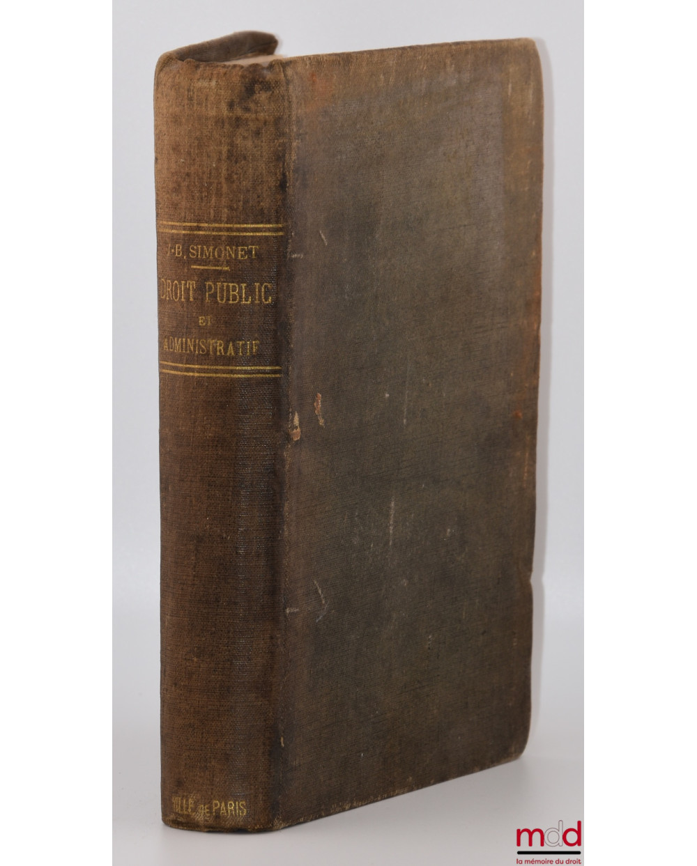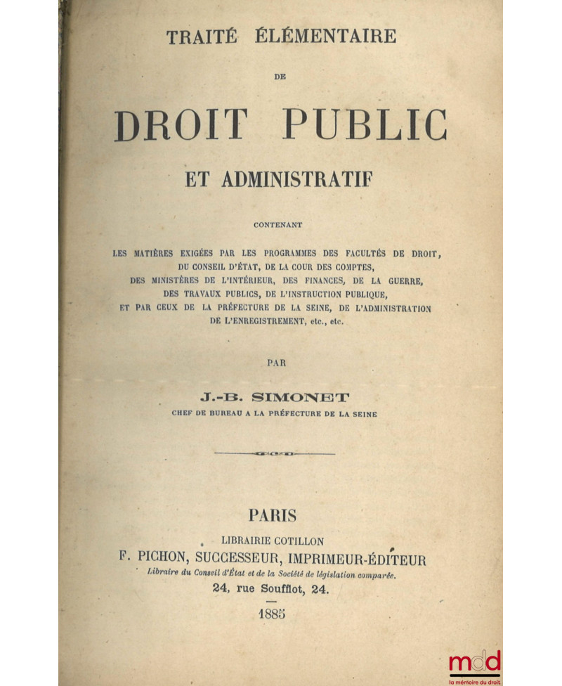 TRAITÉ ÉLÉMENTAIRE DE DROIT PUBLIC ET ADMINISTRATIF, Contenant les matières exigées par les programmes des facultés de droit, du Conseil d’État, de la Cour des comptes, des ministères de l’intérieur, des finances, de la guerre, des travaux publics, de l’instruction publique, et par ceux de la préfecture de la Seine, de l’administration de l’enregistrement, etc., etc.
