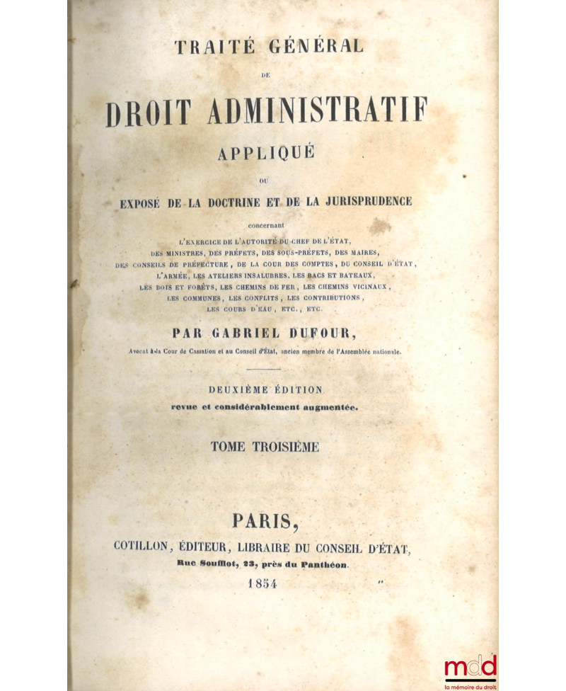 TRAITÉ GÉNÉRAL DE DROIT ADMINISTRATIF APPLIQUÉ ou EXPOSÉ DE LA DOCTRINE ET DE LA JURISPRUDENCE concernant l’exercice de l’autorité de l’empereur, des ministres, des préfets des sous-préfets, des maires, des conseils de préfecture, de la cour des comptes, du conseil d’état ; l’armée, les ateliers insalubres, les bacs et bateaux, les bois et forêts, les chemins de fer, les chemins vicinaux, les communes, les conflits, les contributions, les cours d’eau, etc., 2e éd. [t. III à VI seuls]