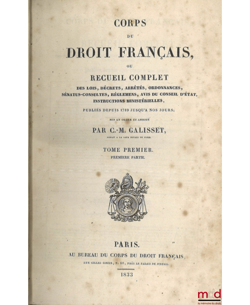 CORPS DU DROIT FRANÇAIS OU RECUEIL COMPLET DES LOIS, DÉCRETS, ARRÊTÉS, ORDONNANCES, SÉNATUS-CONSULTES, RÈGLEMENS, AVIS DU CONSEIL D’ÉTAT, INSTRUCTIONS MINISTÉRIELLES, Publié depuis 1789 jusqu’à nos jours, [t. I à III]TABLE GÉNÉRALE DU CORPS DU DROIT FRANÇAIS OU RECUEIL COMPLET DES LOIS, [...], 1789 À 1824