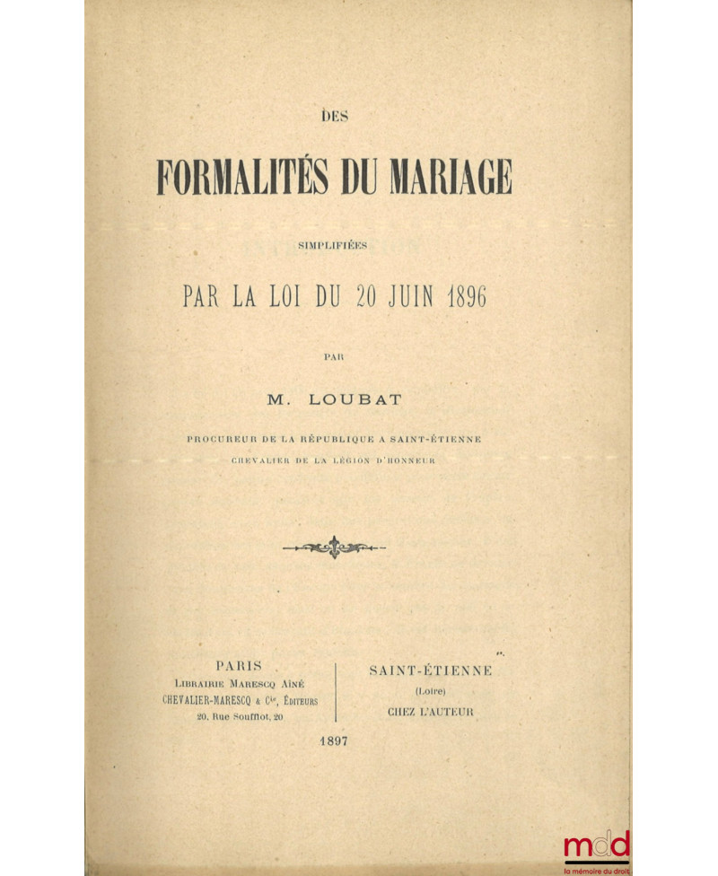 DES FORMALITÉS DU MARIAGE SIMPLIFIÉES PAR LA LOI DU 20 JUIN 1896