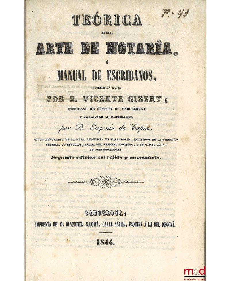 Teórica del arte de notaría, ó Manual de escribanos, Escrito en latin por D. Vicente Gibert ; Escribano de número de Barcelona ; y traducido al Castellano por D. Eugenio de Capia, Segunda edicion correjida y aumentada