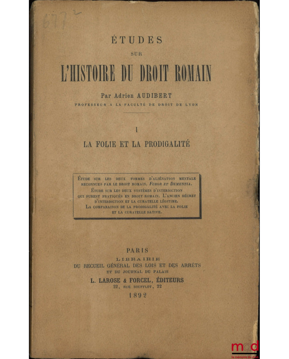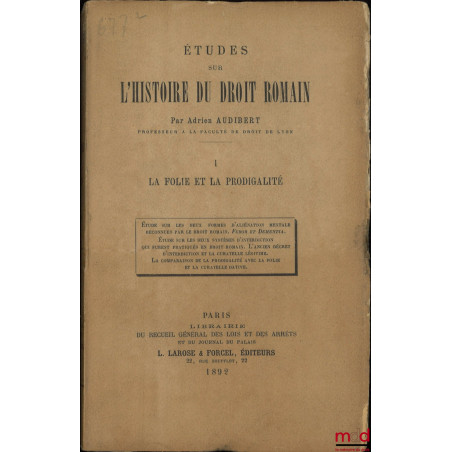 ÉTUDES SUR L’HISTOIRE DU DROIT ROMAIN, t. I [seul paru] : La folie et la prodigalité, Étude sur les deux formes d’aliénation mentale reconnues par le droit romain. Furor et Dementia. Étude sur les deux systèmes d’interdiction qui furent pratiqués en droit romain. L’ancien décret d’interdiction et la curatelle légitime. La comparaison de la prodigalité avec la folie et la curatelle dative.
