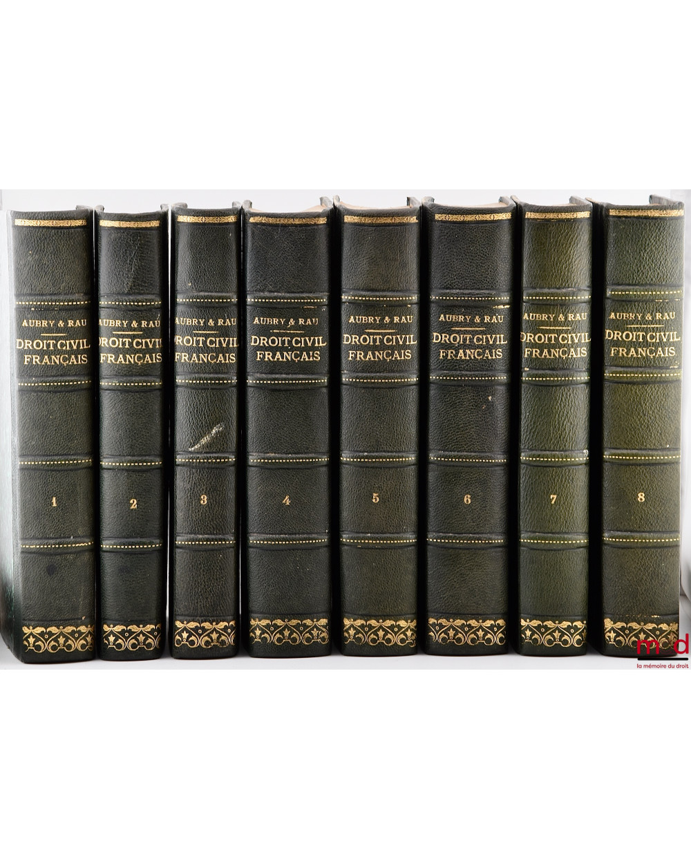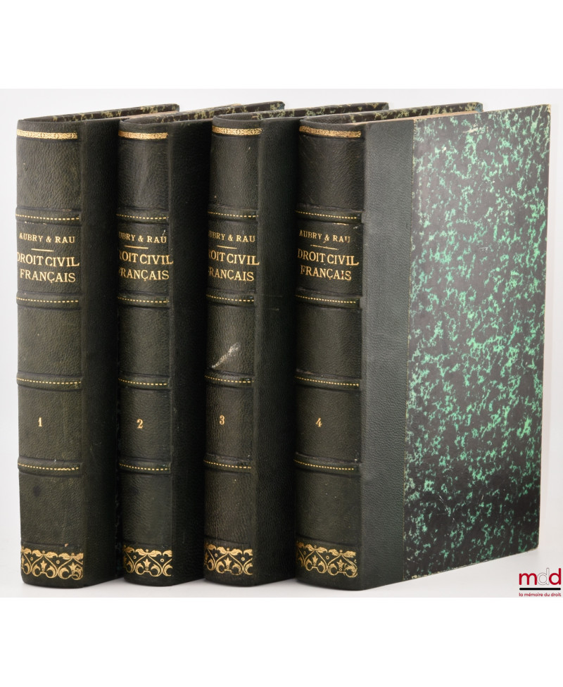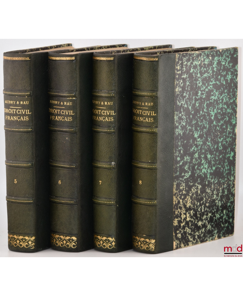 Comme le souligne J.-L. Halpérin (n° 34), Aubry et Rau « apportèrent une véritable révolution dans la méthode d’exposition du droit civil. Ne s’astreignant pas à suivre le Code Civil article par article ils cherchèrent à réaliser un traité raisonné en alliant la méthode exégétique et l’enseignement dogmatique. Ils voulurent également associer la théorie et la pratique en combinant la pure logique d’un texte précis et rigoureux avec la richesse de notes volumineuses consacrées à la jurisprudence et à la discussion des opinions ». Notre exemplaire est tiré de l’édition qui est usuellement citée (J.-L. Halpérin loc. cit.) et présenté, ici, dans une superbe reliure.