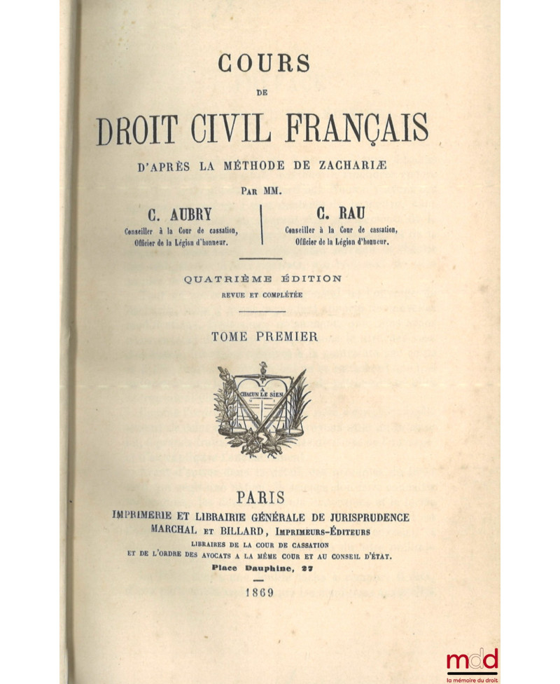 COURS DE DROIT CIVIL FRANÇAIS D’APRÈS LA MÉTHODE DE ZACHARIÆ, 4e éd. revue et complétée
