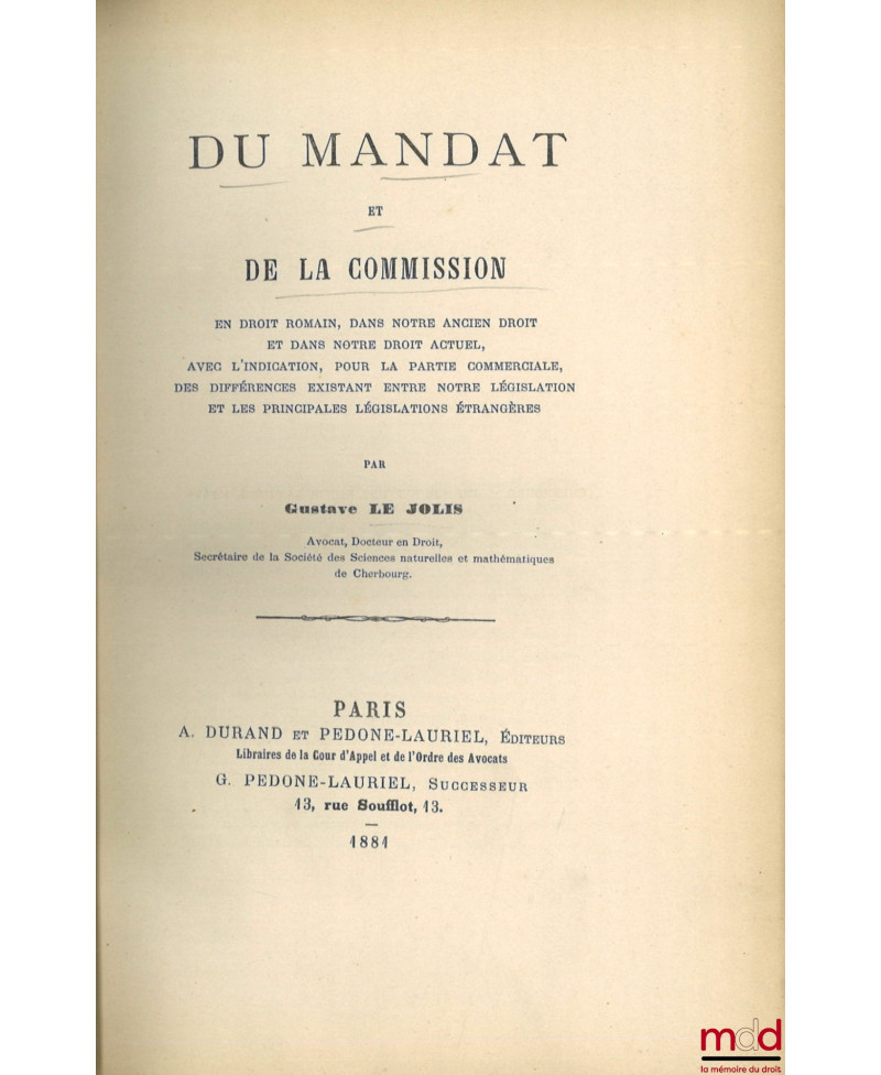 DU MANDAT ET DE LA COMMISSION en droit romain, dans notre ancien droit et dans notre droit actuel, avec l’indication, pour la partie commerciale, des différences existant entre notre législation et les principales législations étrangères