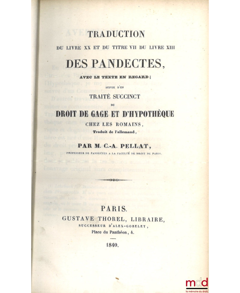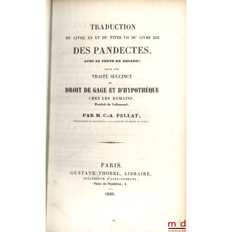 TRADUCTION DU LIVRE XX ET DU TITRE VII DU LIVRE XIII DES PANDECTES, AVEC LE TEXTE EN REGARD ; suivie d’un TRAITÉ SUCCINCT DU DROIT DE GAGE ET D’HYPOTHÈQUE CHEZ LES ROMAINS
