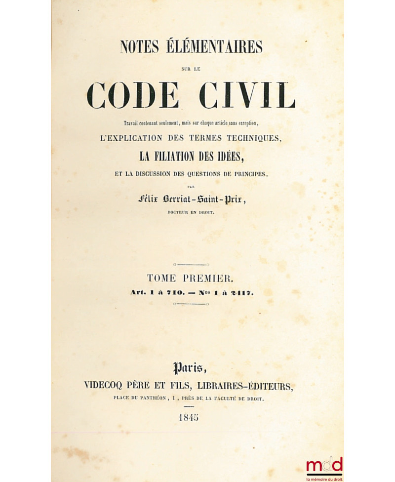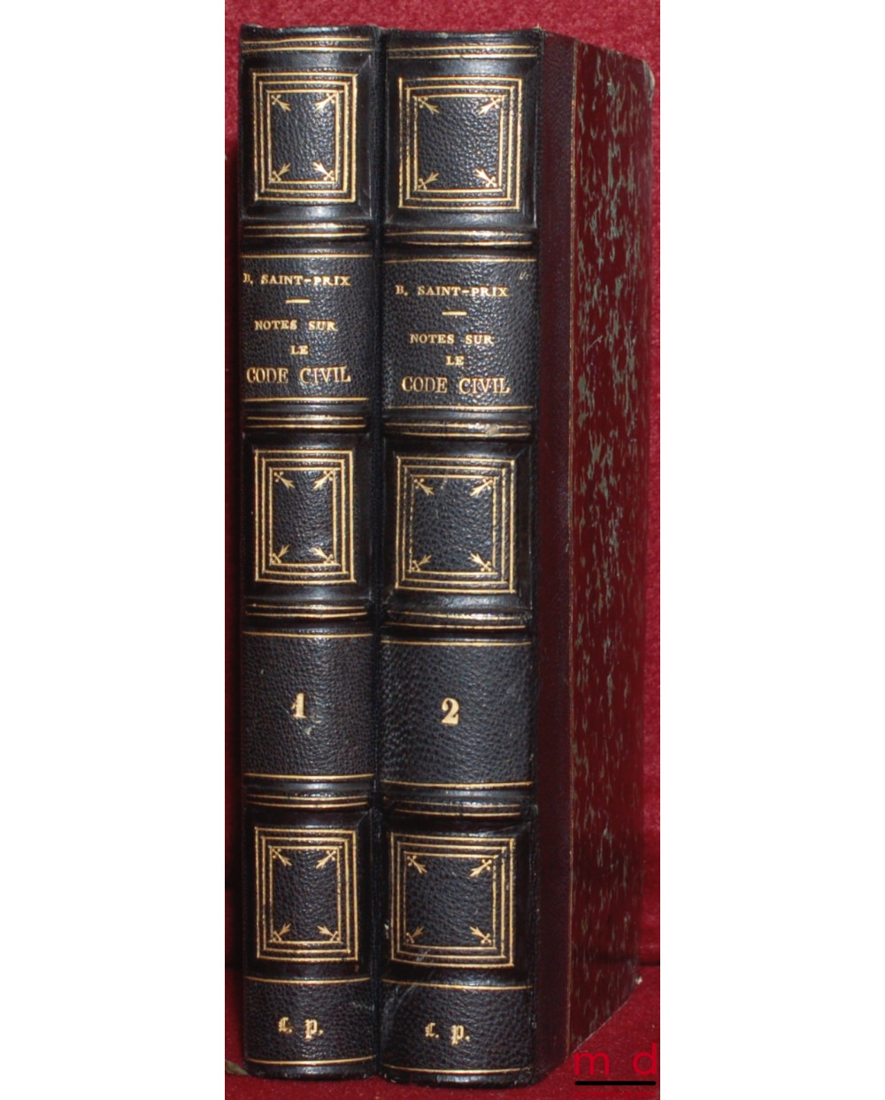 NOTES ÉLÉMENTAIRES SUR LE CODE CIVIL, Travail contenant seulement, mais sur chaque article sans exception, l’explication des termes techniques, la filiation des idées, et la discussions de questions de principes, t. I et t. II (mq. t. III)