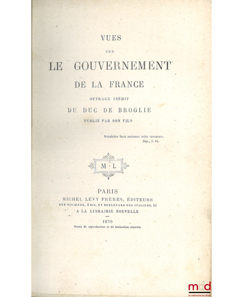 Texte de la plus grande rareté dont la publication fut empêchée en 1861, Victor de Broglie étant un des plus virulents contempteurs du régime impérial. L’édition faite juste avant la Guerre de 1870 par son fils connaîtra également un succès très limité (v. J.-P. Machelon, Victor de Broglie et les vues sur le gouvernement de la France in Coppet Creuset de l’esprit libéral, Economica 2000). Ce texte est pourtant d’une importance majeure pour la réflexion politique et constitutionnelle car il embrasse l’ensemble des questions politiques et administratives pour établir une véritable vulgate de la monarchie constitutionnelle à la française. L’auteur y reproduit également, pour ce qui concerne l’organisation du Conseil d’État, les parties les plus importantes de l’article qu’il avait fait paraître à la Revue française en 1828 et qu’il avait tenté de mettre en œuvre en 1830 lorsqu’il avait été nommé Président du Conseil d’État.