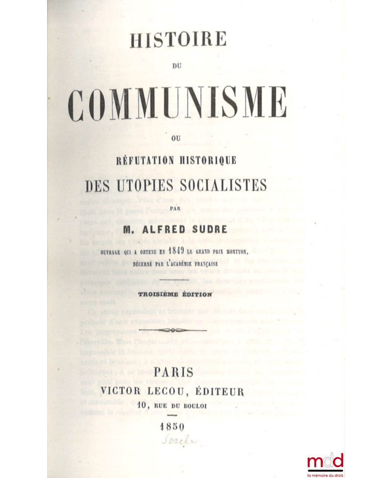 HISTOIRE DU COMMUNISME OU RÉFUTATION HISTORIQUE DES UTOPIES SOCIALISTES, 3e éd.