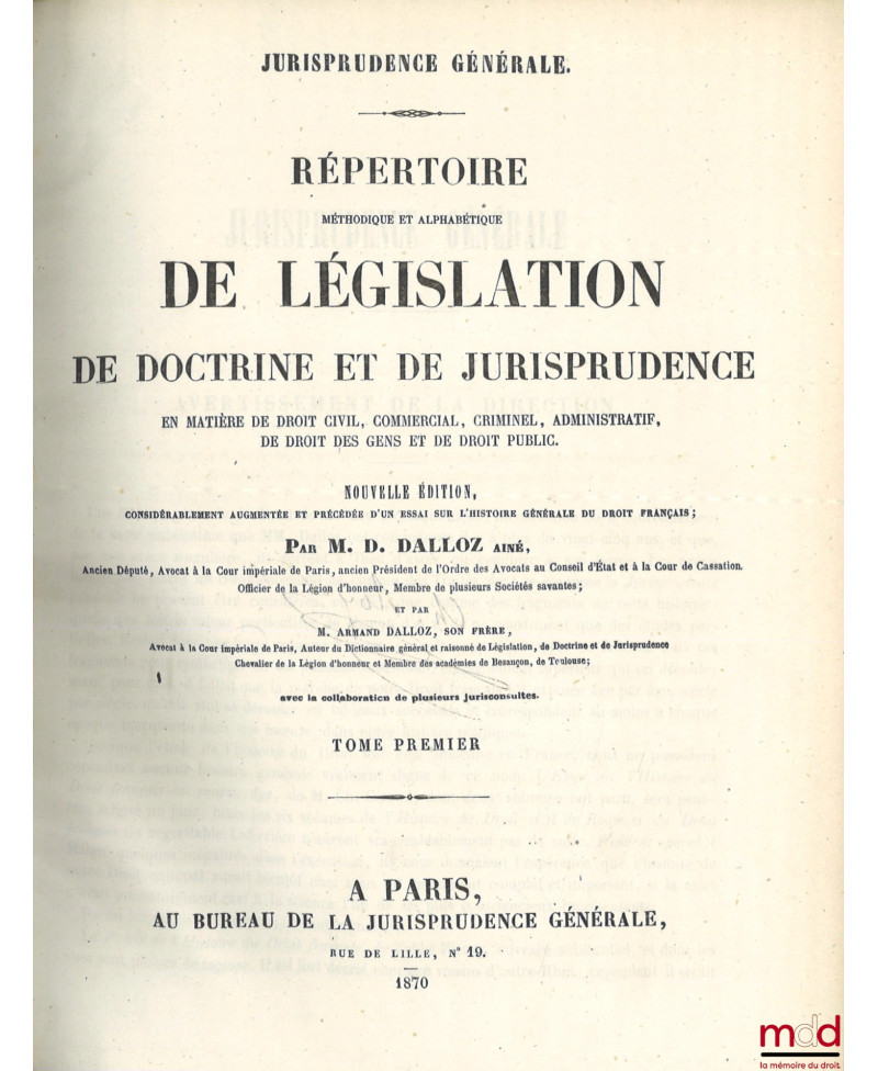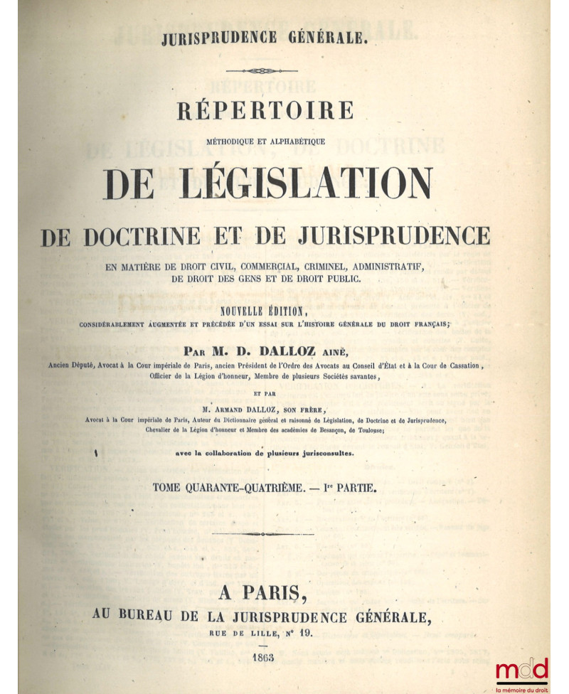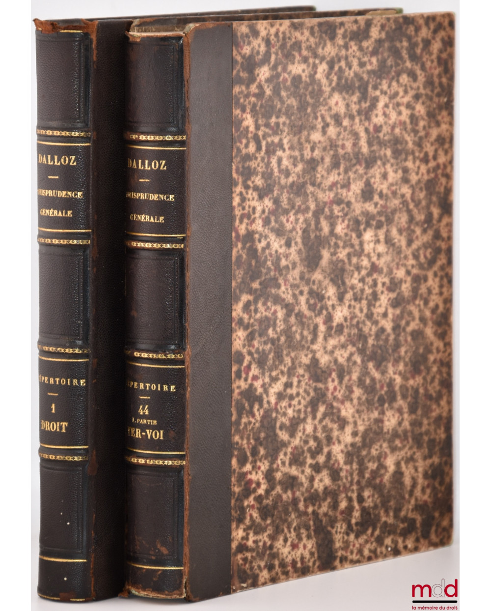 JURISPRUDENCE GÉNÉRALE, RÉPERTOIRE MÉTHODIQUE ET ALPHABÉTIQUE DE LÉGISLATION, DE DOCTRINE ET DE JURISPRUDENCE, en matière de droit civil, commercial, criminel, administratif, de droit des gens et de droit public, nouvelle éd. considérablement augmentée et précédée d’un essai sur l’histoire générale du droit français., t. 1 et 44 Ire partie uniquement