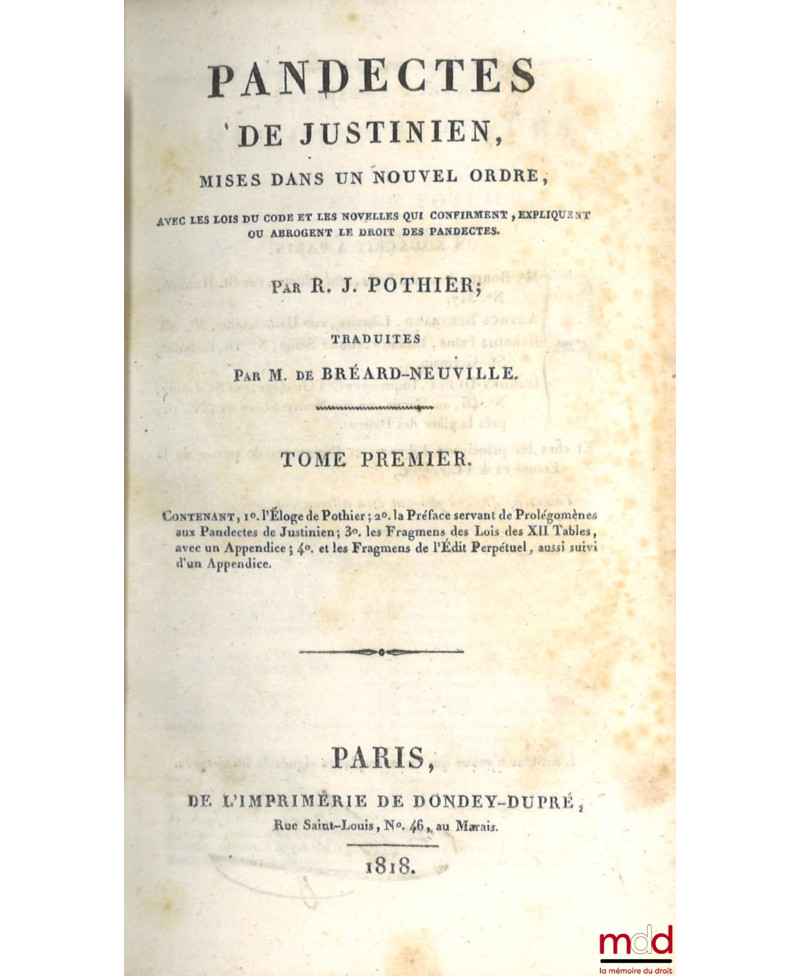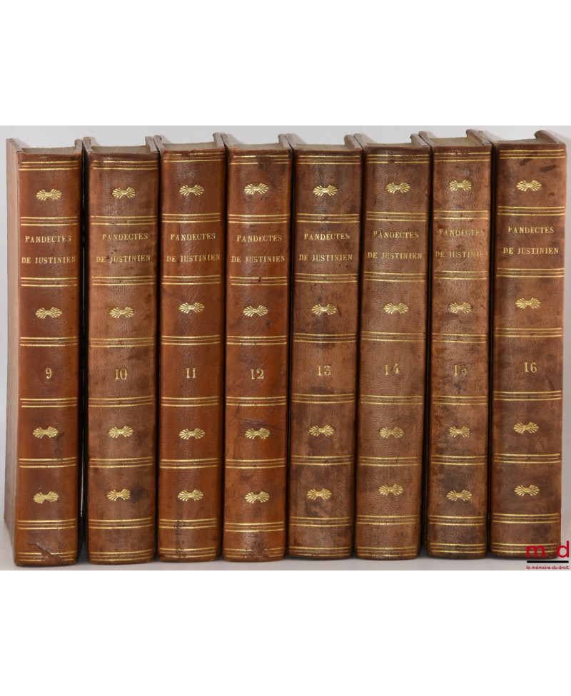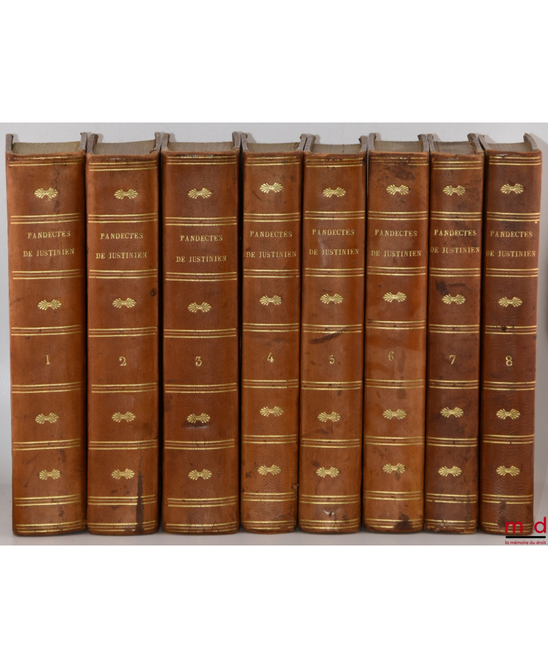 L’édition que donna P. des Pandectes fut peut-être la seule œuvre consistante faisant progresser le droit romain, dans la doctrine française du XVIIIe siècle. Giraud souligne dans son « Introduction au droit romain » (p. 429) que l’intérêt du travail de Pothier est qu’il permet de trouver d’un seul coup toutes les lois du digeste (autrement dit des Pandectes), du Code, des Institutes et des Novelles, qui soit sont identiques, soit se modifient et s’expliquent l’une l’autre. Il poursuit : « cet ouvrage est l’un des plus utiles et des plus recommandables qu’ait été composé pour la connaissance et l’interprétation du droit romain ». Il faut souligner la présence d’un glossaire des auteurs du droit romain rédigé dans un latin parfaitement compréhensible et qui permet d’avoir de brèves indications sur l’essentiel des jurisconsultes romains mais aussi sur les principaux auteurs de la doctrine romaniste moderne.Nous disposons ici de l’une des éditions les plus rares. En effet, il s’agit de celle retenue le plus souvent pour la recherche scientifique du fait qu’elle contient en regard le texte latin et la traduction française. Elle constitue la traduction la plus fouillée et complète des Institutes de Justinien au XIXe siècle de bien meilleure qualité que celle - antérieure - par Hulot et Berthelot.