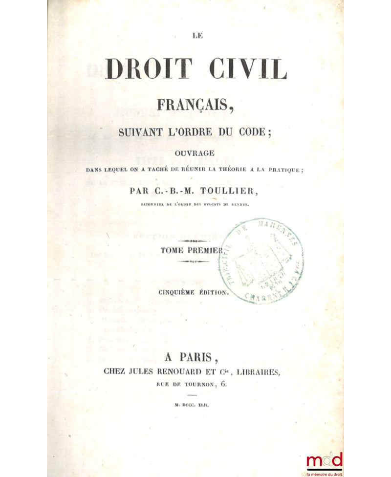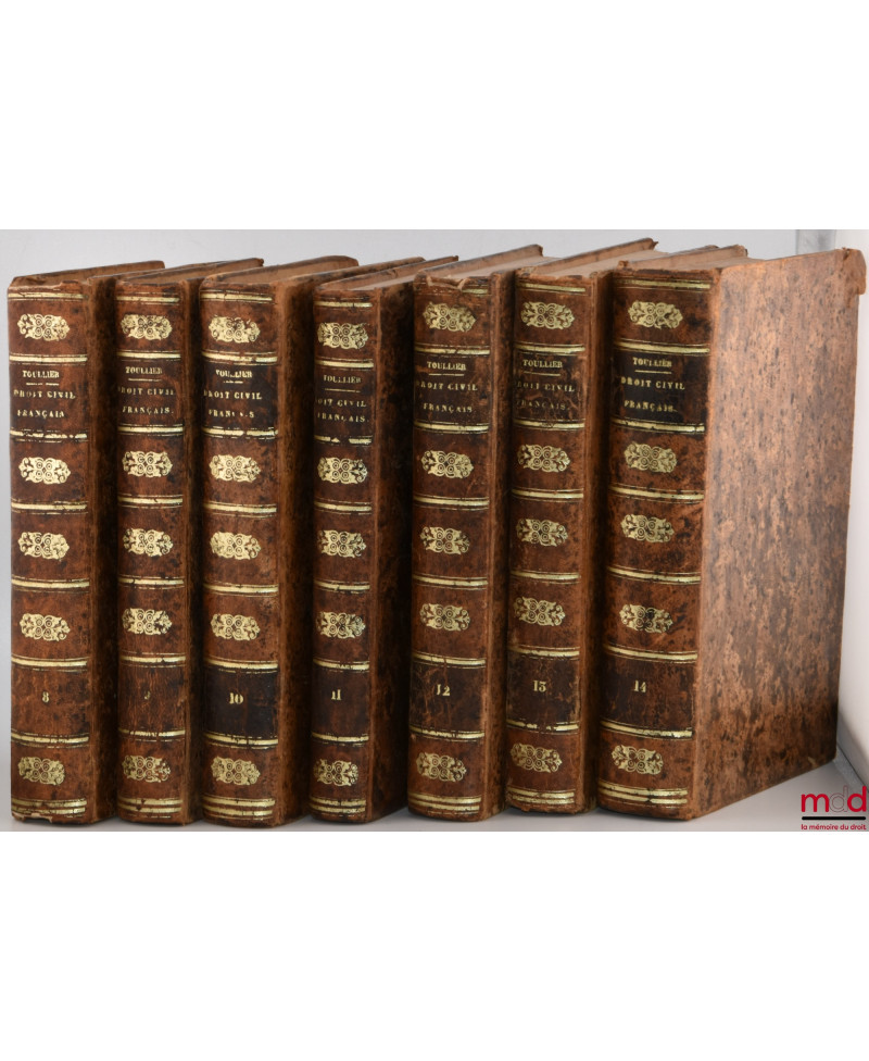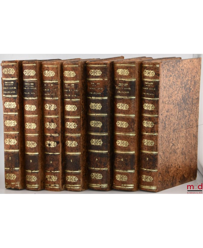 Un des plus importants traités de droit civil du début du XIXe siècle. J.-L. Halpérin montre que, bien que resté inachevé, ce traité dépasse en ampleur tous ses devanciers et fit la renommée de Toullier. L’auteur apparaît comme un homme des Lumières attaché à la liberté des personnes et ses conceptions jus naturaliste l’ont amené à dépasser le cadre étroit d’un commentaire purement exégétique du Code Civil. La parution successive des volumes de ce traité fut un des plus grands sujets de débats de la Thémis et bon nombre des articles de cette revue sont consacrés à la discussion des mérites ou des aspects contestables de l’ouvrage. Il est rare d’avoir une édition aussi homogène dans sa date d’édition.