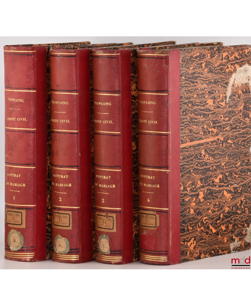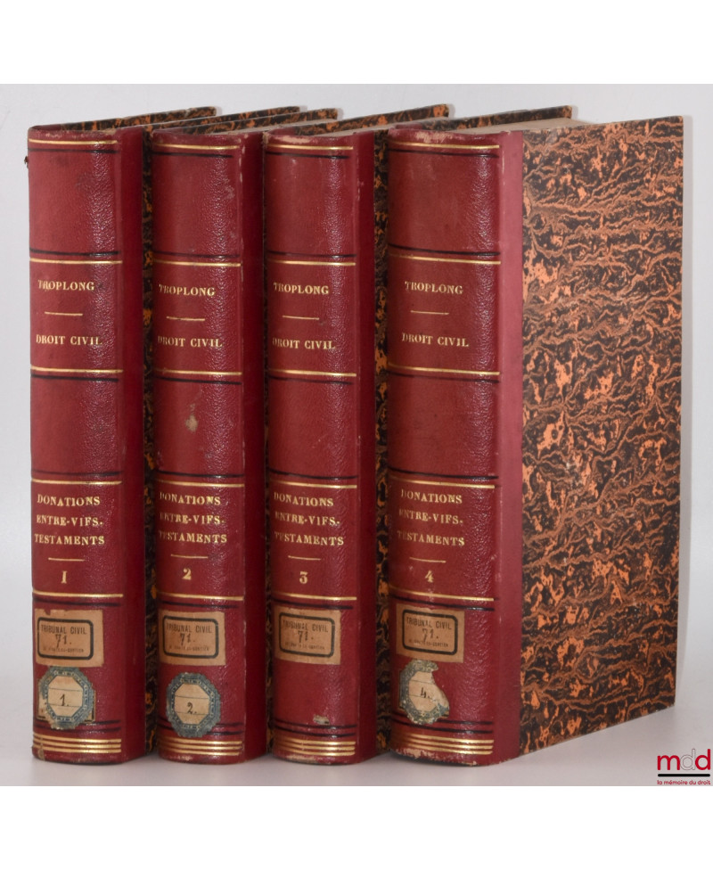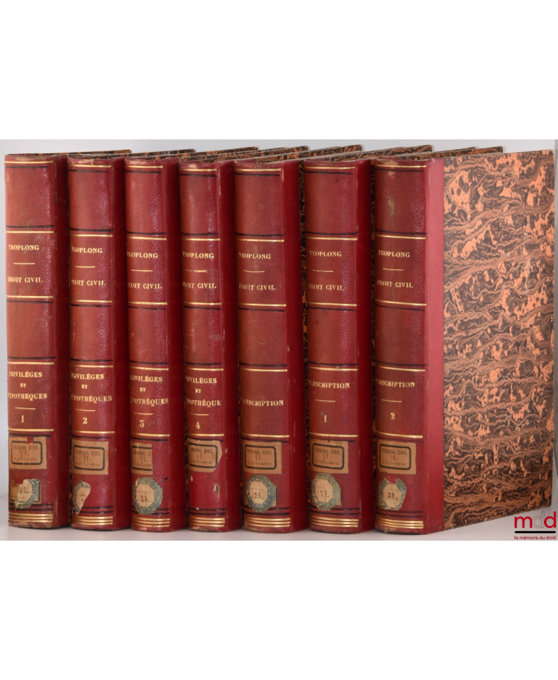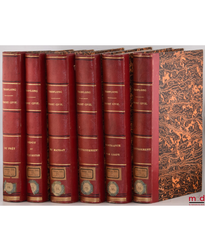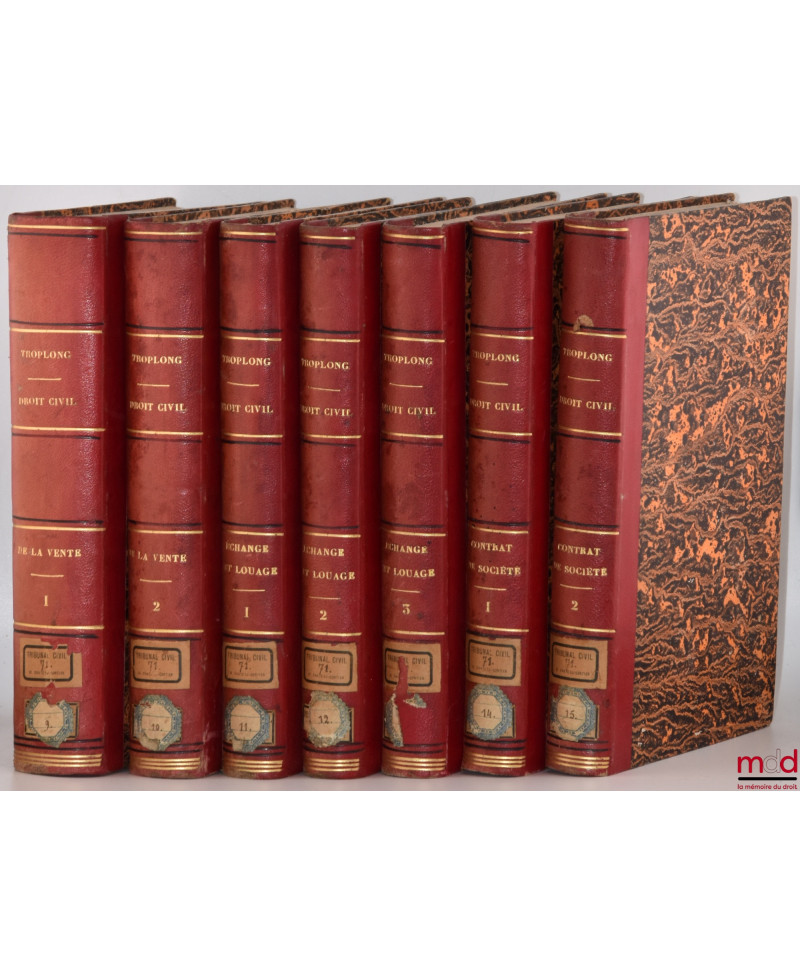 On ne reviendra pas sur la réhabilitation dont fait aujourd’hui l’objet l’œuvre de Troplong (v. catalogue 13). Evoquons plutôt ici la bibliographie de cet ensemble. Troplong se présenta au même titre que Duvergier comme le continuateur du traité que Toullier laissa inachevé à sa mort (il est à noter que Duvergier a de meilleurs droits que Troplong pour cela puisque c’était Toullier lui-même qui lui avait demandé de s’en charger !). Troplong se mit en outre au travail de manière désordonnée. Il publia en même temps les volumes consacrés à la vente, dans le prolongement immédiat de T., mais aussi ceux consacrés à la prescription, et donc concernant les derniers art. du Code. Il continua ensuite par les privilèges et hypothèques, puis le louage et l’échange, il termina, dans l’ordre, par les autres titres. Il est à noter que si les premiers vol. parurent en 1833, les nouvelles éditions se présentent elles mêmes comme "entièrement conformes aux précédentes". Cette première série fut achevée en 1856 avec le vol. sur "le commentaire de la loi du 23 mars 1855..". T. entreprit alors, dans une deuxième série, de reprendre la partie code qui avait été traitée par Toullier. Il donna ainsi les quatre vol. du "Contrat de mariage" (1851) et les 4 des "donations et testaments" (1855) mais mourut à son tour, avant d’avoir, et de loin, achevé son œuvre. Rare édition française complète et conservée ici en bon état.