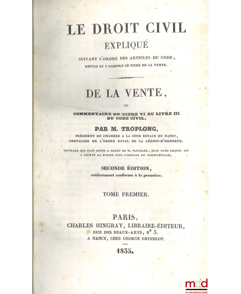 LE DROIT CIVIL EXPLIQUÉ SUIVANT L’ORDRE DES ARTICLES DU CODE DEPUIS ET Y COMPRIS LE TITRE DE LA VENTE, Ouvrage qui fait suite à celui de M. Toullier, mais dans lequel on a adopté la forme plus commode du commentaire :PREMIÈRE SÉRIE- De la VENTE 2 vol. 2e éd. 1835, entièrement conforme à la première et à la deuxième ; commentaire du titre VI du livre III du code civil ; - De l’ÉCHANGE et du LOUAGE 3 vol. 1re éd. 1840 ; commentaire des titres VII et VIII du livre III du CC.- Du CONTRAT de SOCIÉTÉ 2 vol. 1re éd. 1843 ; commentaire du titre IX du livre III du CC.- Du PRÊT 1 vol. 1re éd. 1845 ; commentaire du titre X livre III du CC- Du DÉPÔT et du SÉQUESTRE et des CONTRATS ALÉATOIRES 1 vol., 1re éd. 1845 ; commentaire des titres XI et XII livre III du CC.- Du MANDAT 1 vol. 1re éd. 1846 ; commentaire du titre XIII du livre III du CC.- Du CAUTIONNEMENT et des TRANSACTIONS, 1 vol., 1re éd. 1846 ; commentaire des titres XIV et XV livre III du CC.- De la CONTRAINTE PAR CORPS en matière civile et de commerce, 1 vol., 1re éd. 1847 ; commentaire du titre XVI livre III du CC.- Du NANTISSEMENT du GAGE et de l’ANTICHRÈSE 1 vol., 1re éd. 1847 ; commentaire du titre XVII livre III du CC.- Des PRIVILÈGES et HYPOTHÈQUES, 4 vol. 2e éd. 1835 ; commentaire du titre XVIII du livre III du CC.- Des PRIVILÈGES et HYPOTHÈQUES, 1 vol. éd. 1856 ; commentaire de la loi du 23 mars 1855 sur la TRANSCRIPTION ; ce commentaire est suivi d’un appendice contenant 1° le rapport et la discussion au corps législatif ; 2° les instructions de la direction générale des domaines et de l’enregistrement à ses agents, concernant l’interprétation de cette loi nouvelle. - De la PRESCRIPTION 2 vol., 1re éd., 1835 ; commentaire du titre XX du livre III du CC.SECONDE SÉRIE- Des DONATIONS et TESTAMENTS 4 vol., 1re éd. 1855 ; commentaire du titre II du livre III du Code Napoléon- Du CONTRAT de MARIAGE et des droits respectifs des époux 4 vol., 2e éd. 1851, augmentée d’une table alphabétique et analytique des matières et de plusieurs arrêts ; commentaire du titre V du livre III du CC