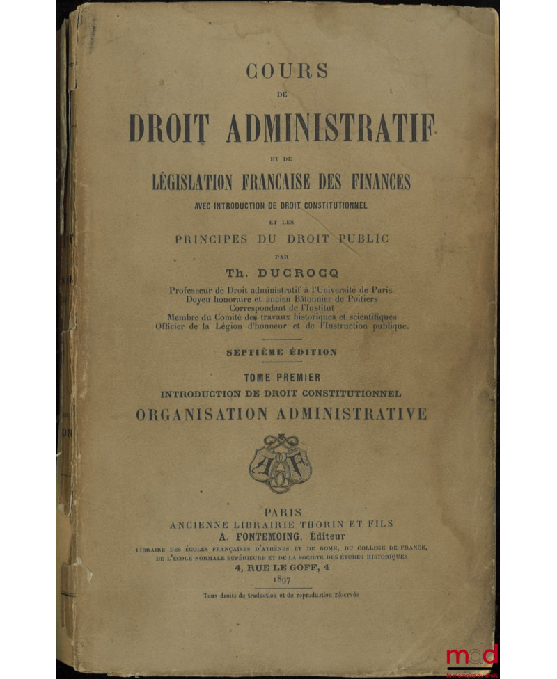 Le cours de Droit Administratif de Ducrocq est la première synthèse de grande ampleur réalisée après les œuvres fondatrices de Cormenin, Vivien et Gérando. Dernière édition en 7 volumes, considérablement augmentée par rapport aux précédentes qui n’en comportaient que 2.« Il est difficile de définir la place de Théophile Ducrocq dans l’évolution du droit administratif, sauf à retenir le terme de « charnière » qui ne veut, au fond, pas dire grand-chose.On peut le considérer comme un conservateur, ce dont témoigne le fait qu’il écarte au profit d’un empirisme de bon aloi toutes les définitions et synthèses sur les critères ou les notions principales du droit administratif. Pour un texte publié à la même époque que le Traité de la juridiction administrative de Laferrière la comparaison est parfois cruelle.Il est encore conservateur en ce qu’il est violemment hostile à la réforme visant à supprimer les Conseils de Préfecture, déposée en 1872, mais même en ce qu’il n’émet pas de critiques particulières contre le fonctionnement de ces conseils, alors que l’on sait que la place prépondérante de l’institution préfectorale était à cette époque très contestée.Mais, réduire Ducrocq à une sorte d’archéologie du droit administratif serait méconnaître son intérêt principal. Par rapport à d’autres ouvrages, même plus volumineux (notamment le Batbie) de la même époque, il contient des informations précieuses sur les régimes administratifs techniques (domanialité, expropriation, police, régime des établissements publics…). En particulier, il a un souci constant de remonter à la source textuelle qui le conduit à fournir des informations très utiles, encore aujourd’hui, par exemple en reproduisant de nombreux avis des sections administratives du Conseil d’État.Le choix le plus judicieux porte sur la dernière édition en 7 vol, qui s’échelonne de 1897 à 1905, qui fait un utile pendant au Traité de Batbie » (F. Rolin, Le blog de Frédéric Rolin).