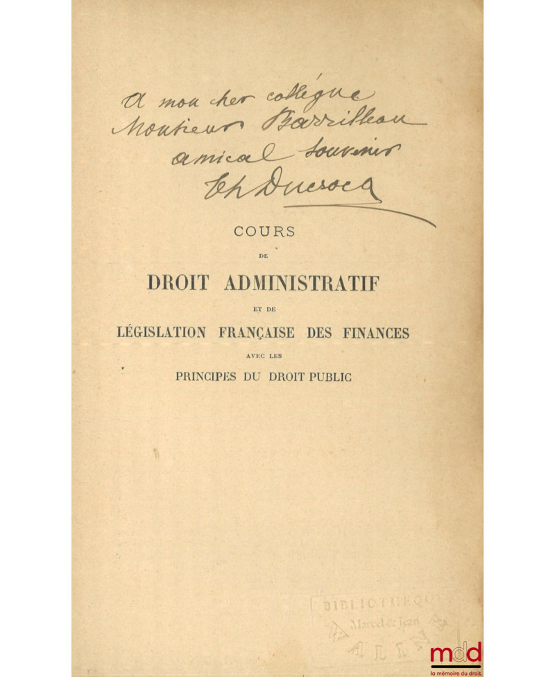 COURS DE DROIT ADMINISTRATIF ET DE LÉGISLATION FRANÇAISE DES FINANCES avec introduction de droit constitutionnel et les Principes du Droit Public, 7e éd.t. I : Introduction de droit constitutionnel, organisation administrative ;t. II : Tribunaux administratifs ;t. III : Principes de droit public, mis en oeuvre par les lois administratives ;t. IV : L’État, personnalité civile et domaine ;t. V : L’État, dette publique et impôts ;t. VII : Tables générales, analytique, alphabétique et par chapitre ; [mq. le t. VI (Personnes civiles autres que l’État)]
