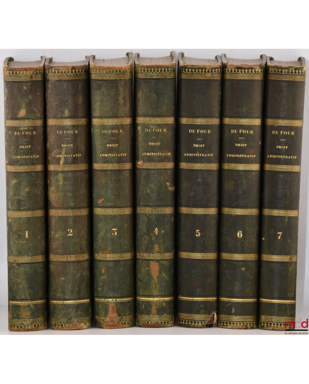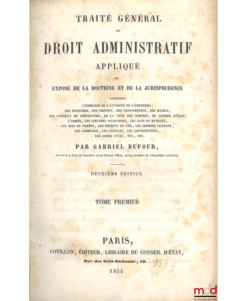 TRAITÉ GÉNÉRAL DE DROIT ADMINISTRATIF APPLIQUÉ ou EXPOSÉ DE LA DOCTRINE ET DE LA JURISPRUDENCE concernant l’exercice de l’autorité du roi, des ministres, des préfets des sous-préfets, des maires, des conseils de préfecture, du conseil d’état, les ateliers insalubres, les bacs et bateaux, les chemins vicinaux, les communes, les conflits, les contributions, les cours d’eau, etc., 2e éd.