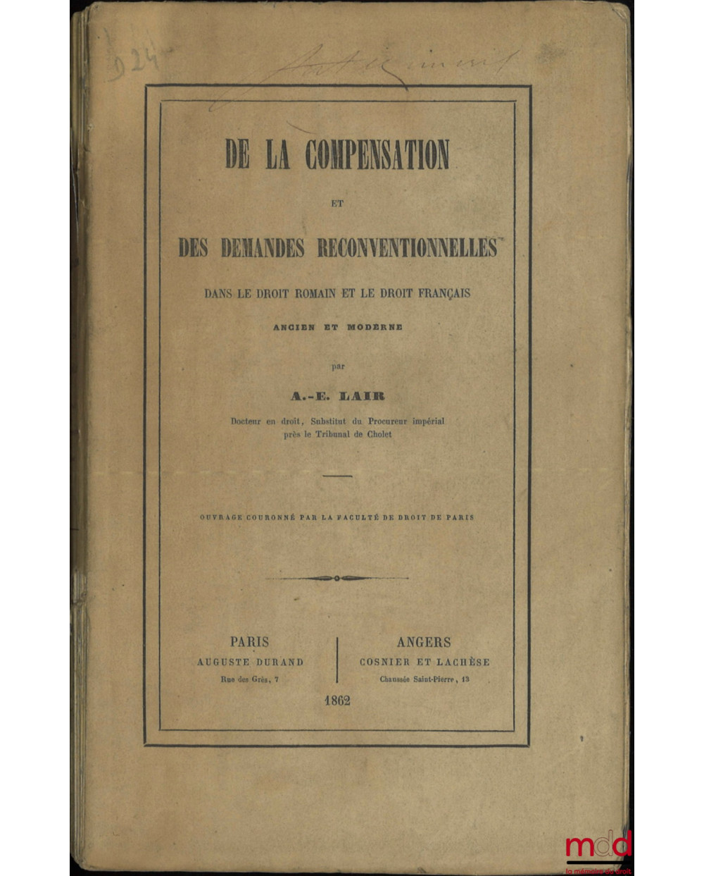 Très bonne thèse, qui constitue un ouvrage de référence sur la compensation et l’action reconventionnelle (voir R. Mendegris, La nature juridique de la compensation, thèse L.G.D.J. 1969, bibliographie). L’étude de droit romain qui porte sur le même sujet conserve, contrairement à ce que l’on constate généralement, un grand intérêt pour l’analyse historique de la notion. Ouvrage de référence au même titre que celui d’Albert Desjardins paru en 1864.