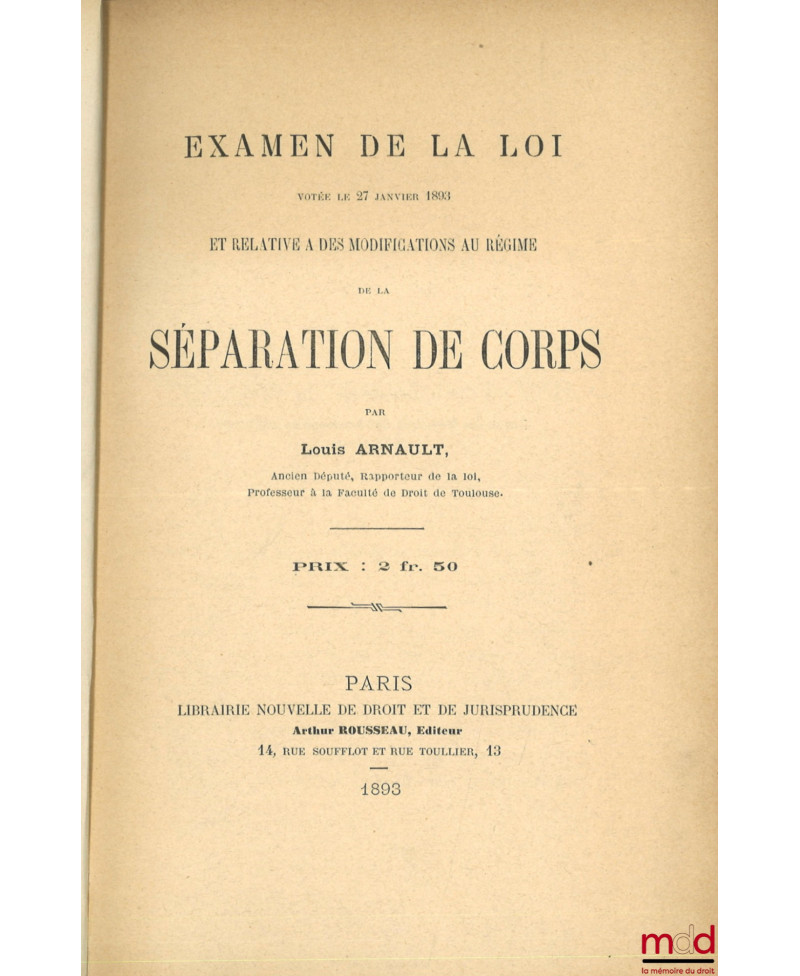 EXAMEN DE LA LOI VOTÉE LE 27 JANVIER 1893 ET RELATIVE À DES MODIFICATIONS AU RÉGIME DE LA SÉPARATION DE CORPS