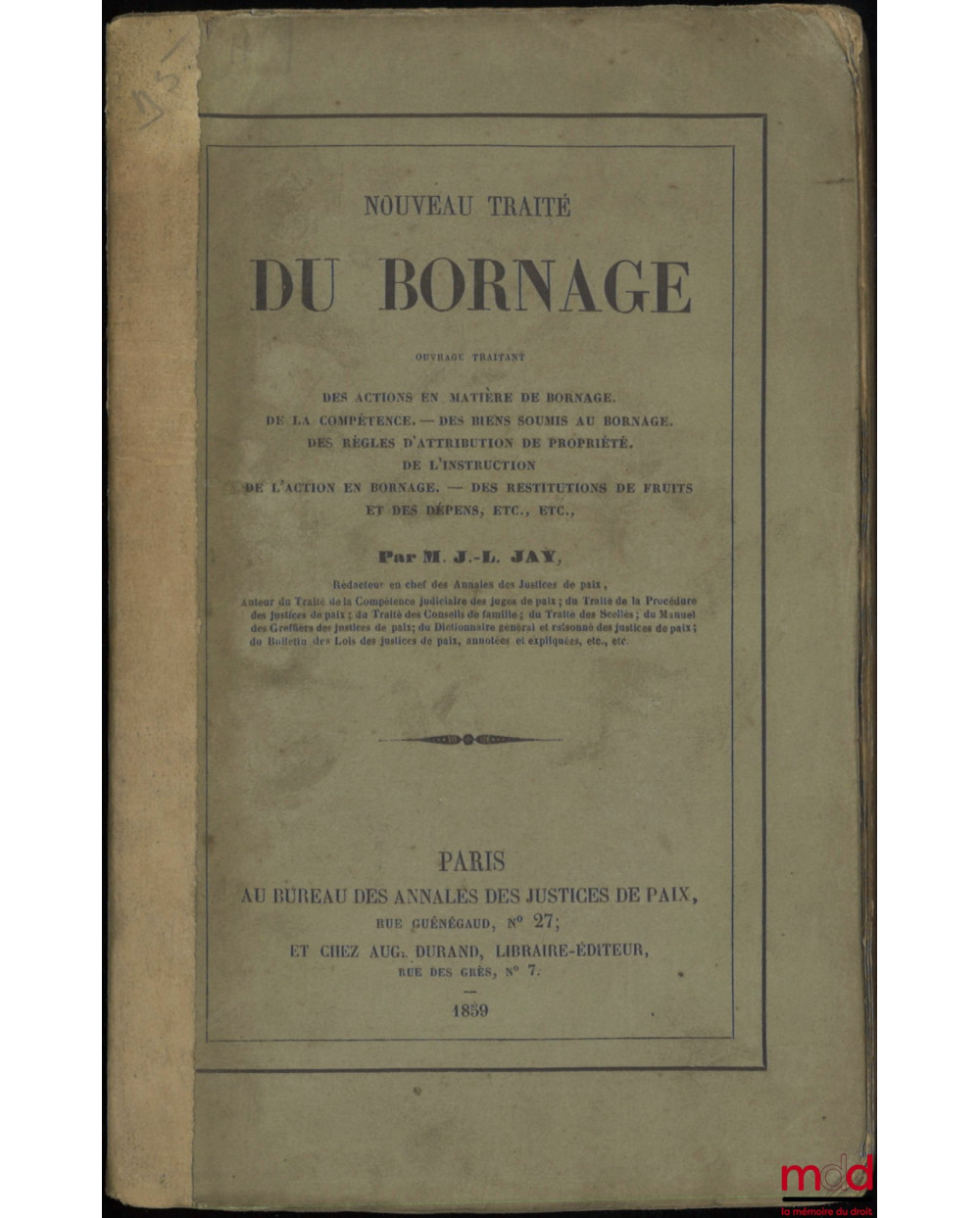 NOUVEAU TRAITÉ DE BORNAGE, Ouvrage traitant des actions en matière de bornage. – De la compétence. – Des biens soumis au bornage. – Des règles d’attribution de propriété. – De l’instruction. – De l’action en bornage. – Des restitutions de fruits et des dépens, etc., etc.
