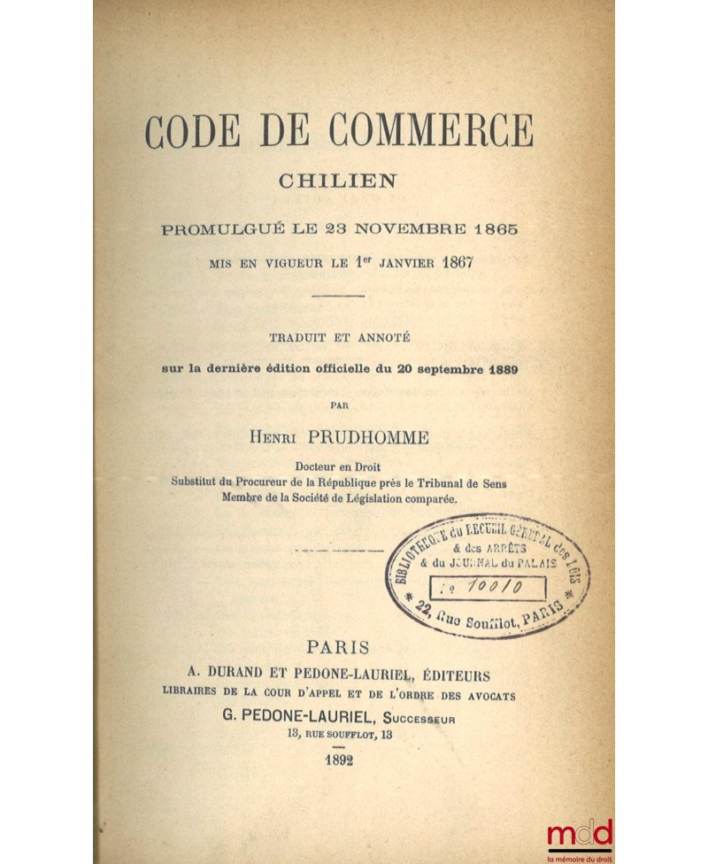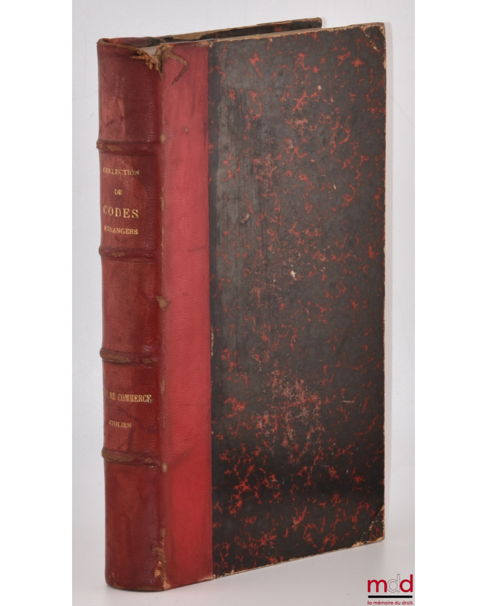 CODE DE COMMERCE CHILIEN Promulgué le 23 novembre 1865 mis en vigueur le 1er janvier 1867, Traduit et annoté sur la dernière éd. officielle du 20 septembre 1889 par Henri Prudhomme, coll. de codes étrangers, t. V