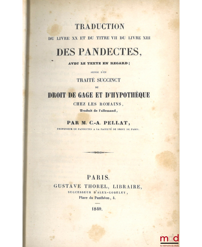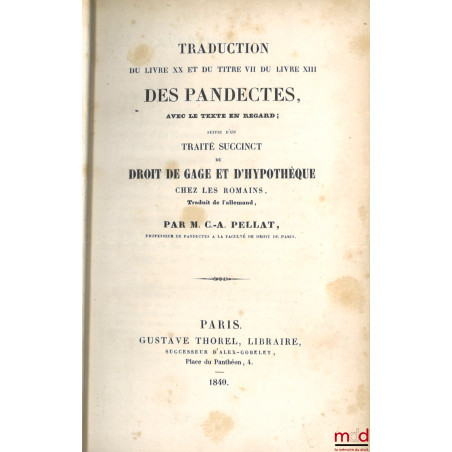 TRADUCTION DU LIVRE XX ET DU TITRE VII DU LIVRE XIII DES PANDECTES, AVEC LE TEXTE EN REGARD ; suivie d’un TRAITÉ SUCCINCT DU DROIT DE GAGE ET D’HYPOTHÈQUE CHEZ LES ROMAINS