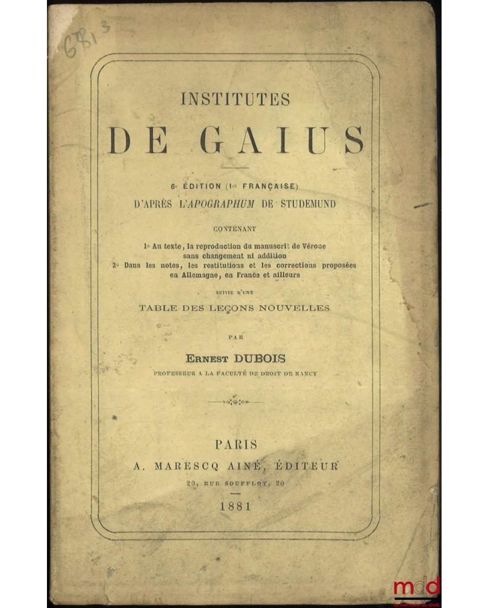 INSTITUTES DE GAIUS, D’après l’apographum de Studemund contenant 1° Au texte, la reproduction du manuscrit de Vérone sans changement ni addition ; 2° Dans les notes, les restitutions et les corrections proposées en Allemagne, en France et ailleurs, Suivie d’une table des leçons nouvelles