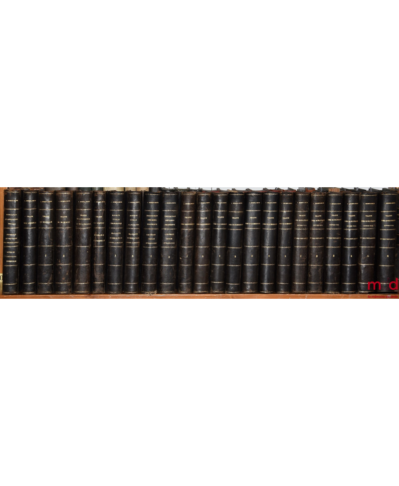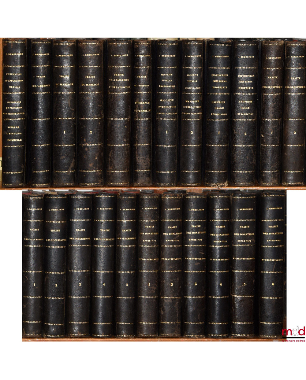 « Les textes avant tout ! Je publie un cours de Code Napoléon ; j’ai donc pour but d’interpréter, d’expliquer le Code Napoléon lui-même, considéré comme loi vivante, comme loi applicable et obligatoire ; et ma préférence pour la méthode dogmatique ne m’empêchera pas de prendre toujours pour base les articles mêmes de la loi ; car je pense, avec Ortolan, que l’enseignement des textes n’emporte pas la nécessité exclusive du commentaire. » (préf. 1re éd.) C’est dans cet esprit que D. nous livre les travaux consacrés à son analyse du Code civil et de poursuivre : « Je ne manquerai donc jamais de faire connaître l’état de la doctrine et surtout de la jurisprudence, cette partie animée, je dirais presque dramatique de la législation […]. Je revendiquerai donc l’autorité des principes partout où elle me semblerait méconnue, même lorsqu’une jurisprudence irréfragable aurait consacré les opinions, que je ne croirais pas devoir suivre. Loin de moi pourtant la présomptueuse ambition de renverser une telle jurisprudence ! Tout en gardant ses convictions de jurisconsulte, il faut savoir, au barreau comme ailleurs, accepter les faits accomplis ; et il est dans la nature des choses non moins que dans l’intérêt public que les mêmes questions finissent par recevoir une solution irrévocable ». Exemplaire intéressant sur le plan de l’édition (une des dernières sur la majorité des tomes)… qui plus est dans une très belle reliure !