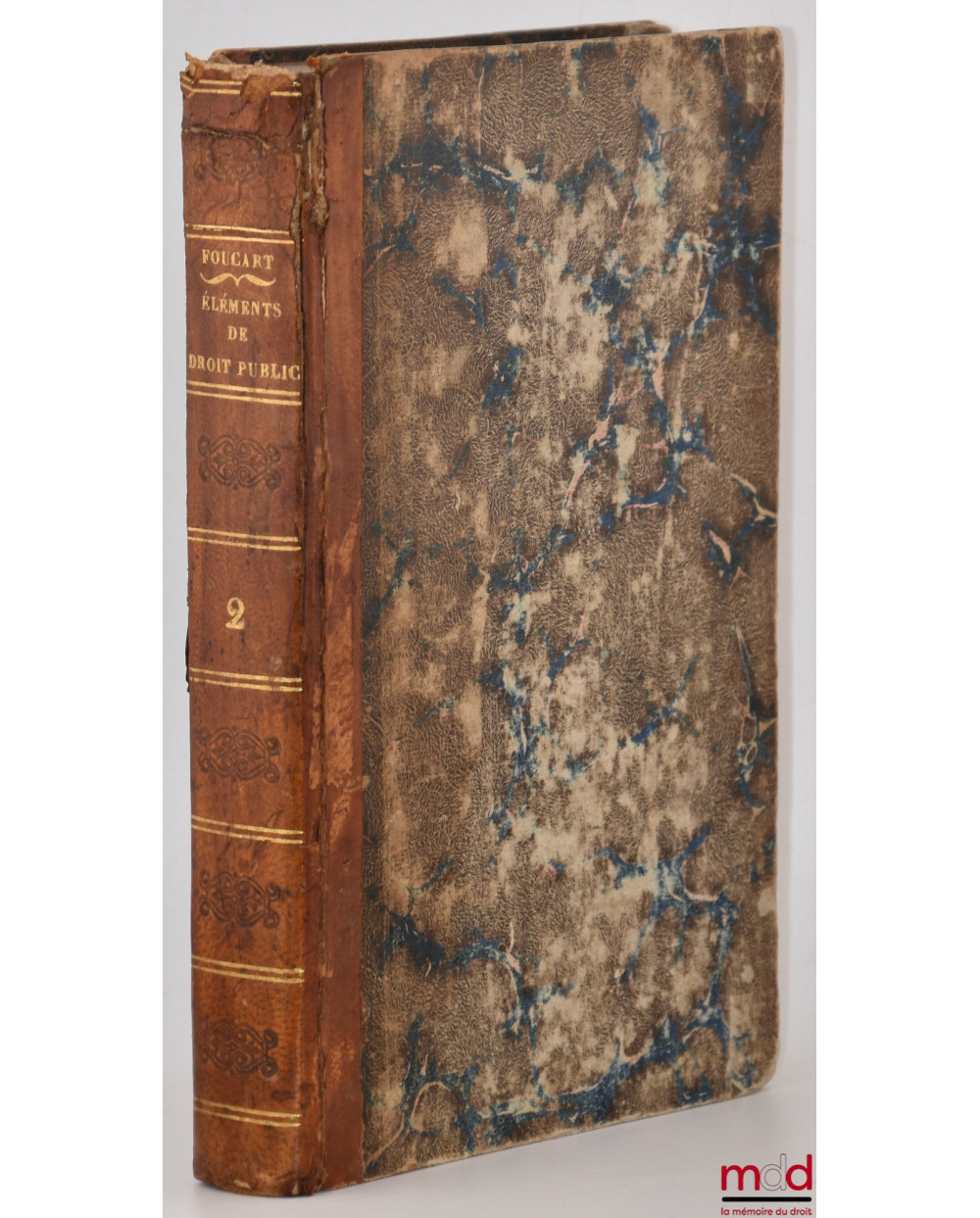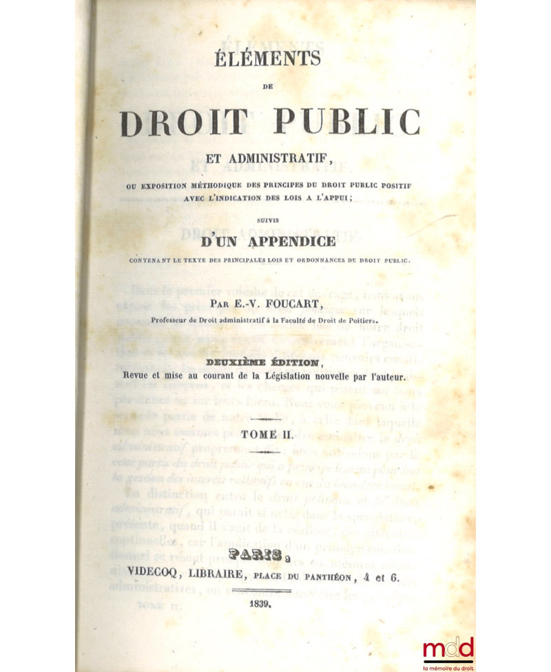 ÉLÉMENTS DE DROIT PUBLIC ET ADMINISTRATIF ou EXPOSITION MÉTHODIQUE DES PRINCIPES DU DROIT PUBLIC POSITIF AVEC INDICATION DES LOIS À L’APPUI, Suvis d’un appendice contenant le texte des principales lois et ordonnances de droit public, 2e éd. Revue et mise au courant de la Législation nouvelle par l’auteur, [t. II uniquement]