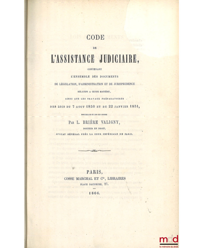 CODE DE L’ASSISTANCE JUDICIAIRE, Contenant l’ensemble des documents de législation, d’administration et de jurisprudence relatifs à cette matière, Ainsi que les travaux préparatoires des Lois du 7 août 1850 et du 22 janvier 1851