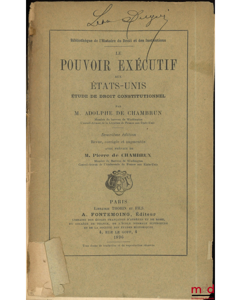 Description : in-8, débr., Ex-libris manuscrit « Léon Duguit », (ouvrage fané), int. frais, [ce livre provient de la bibliothèque personnelle de Léon DUGUIT], XVI-336 p.