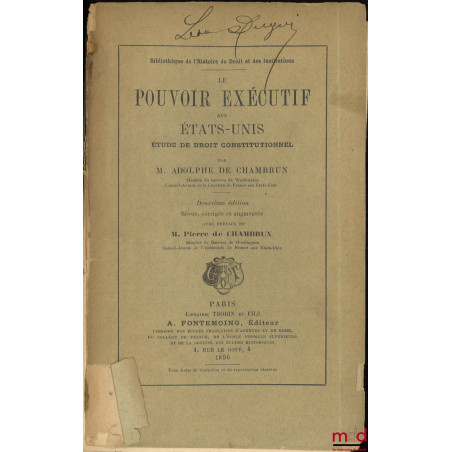 LE POUVOIR EXÉCUTIF AUX ÉTATS-UNIS, Étude de droit constitutionnel, Avec préface de M. Pierre de Chambrun, 2e éd. revue, corrigée et augmentée, Bibl. de l’Histoire du Droit des Institutions
