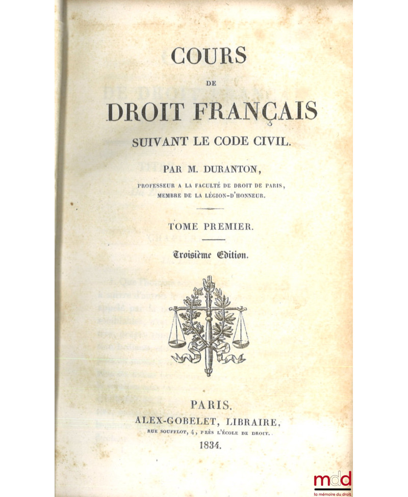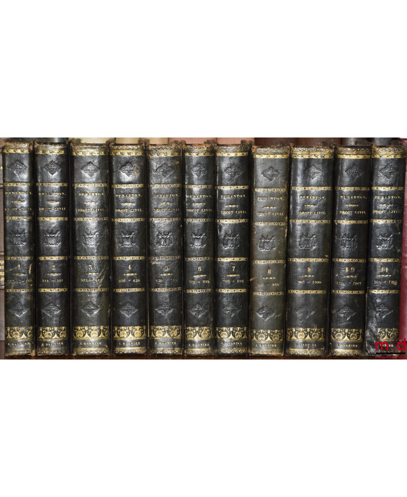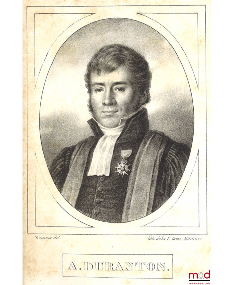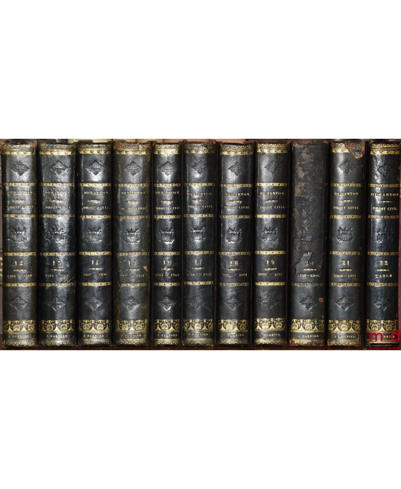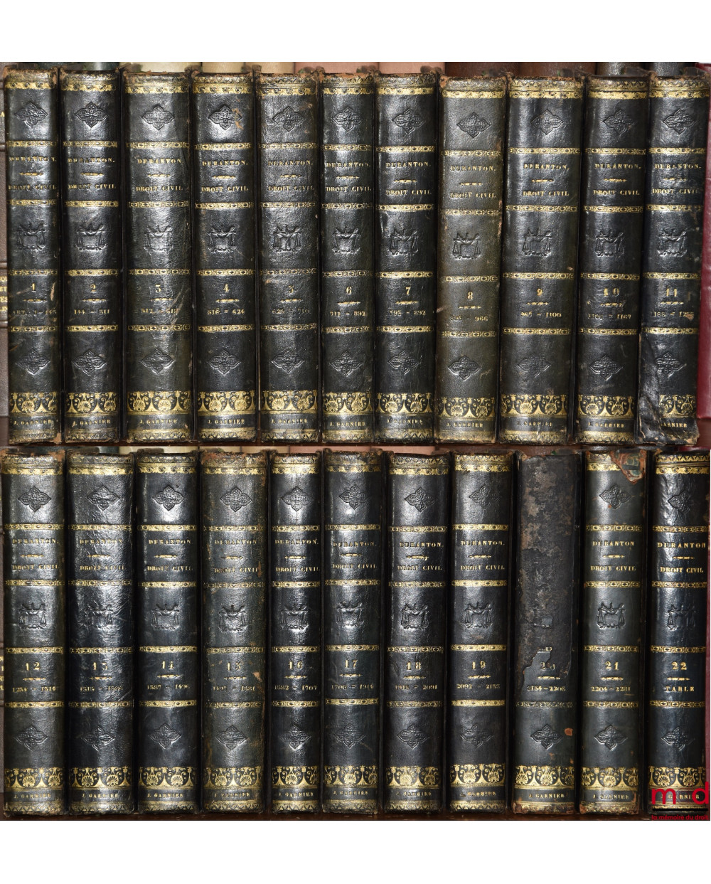 Un des plus importants traités de droit civil du début du XIXe siècle. J.-L. Halpérin montre que, bien que resté inachevé (ce traité dépasse en ampleur tous ses devanciers et fit la renommée de Toullier. L’auteur apparaît comme un homme des Lumières attaché à la liberté des personnes et ses conceptions jus naturaliste l’ont amené à dépasser le cadre étroit d’un commentaire purement exégétique du Code Civil. La parution successive des volumes de ce traité fut un des plus grands sujets de débats de la Thémis et bon nombre des articles de cette revue sont consacrés à la discussion des mérites ou des aspects contestables de l’ouvrage. Il est rare d’avoir une édition aussi homogène dans sa date d’édition. E. Gaudemet ne tarit pas d’éloges non plus : « Duranton a été un très grand travailleur. Il est un des très rares auteurs qui aient réussi à publier intégralement sans collaboration, un traité développé de droit civil. Il avait débuté, dès 1819, par un Traité des contrats et des obligations en général, en quatre volumes. En 1825 commença la publication de son grand ouvrage : Cours de Droit civil français suivant le Code civil, terminé en 1837, alors que les premiers volumes étaient déjà à leur troisième édition. La quatrième édition, la dernière, a paru en 22 volumes (notre exemplaire ne dispose pas de la table de 1845), de 1844 à 1845. Un auteur, Lagrange, a consacré tout un livre à l’étude de cette œuvre, dont le succès, tous ces faits nous le disent, fut immédiat et indiscuté ». Dramard indique que cette édition contient des différences substantielles par rapport aux précédentes qui ne sont, pour ce qui les concernent que des tirages successifs du même texte. Parmi les traités de l’École de l’Exégèse, il s’agit certainement du moins connu et du plus rare.