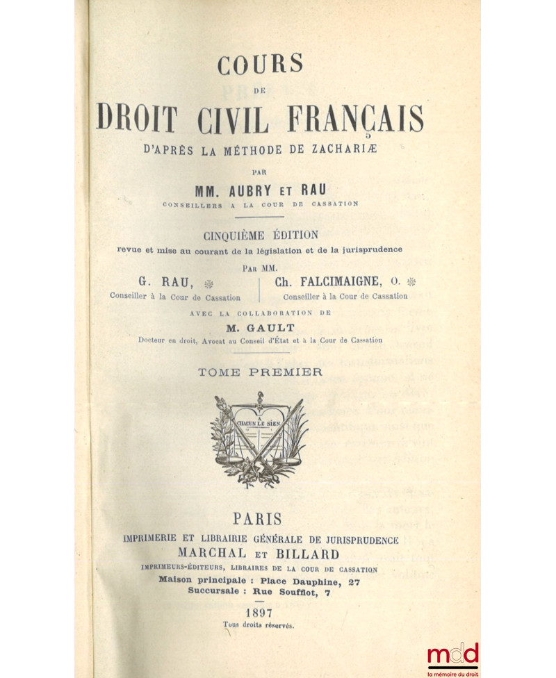 COURS DE DROIT CIVIL FRANÇAIS D’APRÈS LA MÉTHODE DE ZACHARIÆ, 5e éd. revue et mise au courant de la législation et de la jurisprudence par G. Rau et Ch. Falcimaigne avec la collaboration de M. Gault