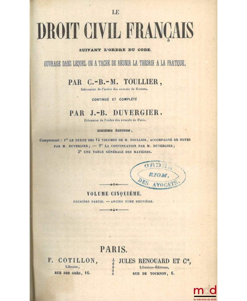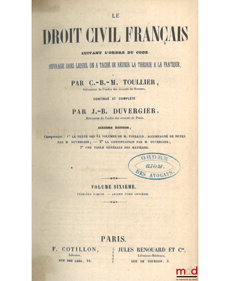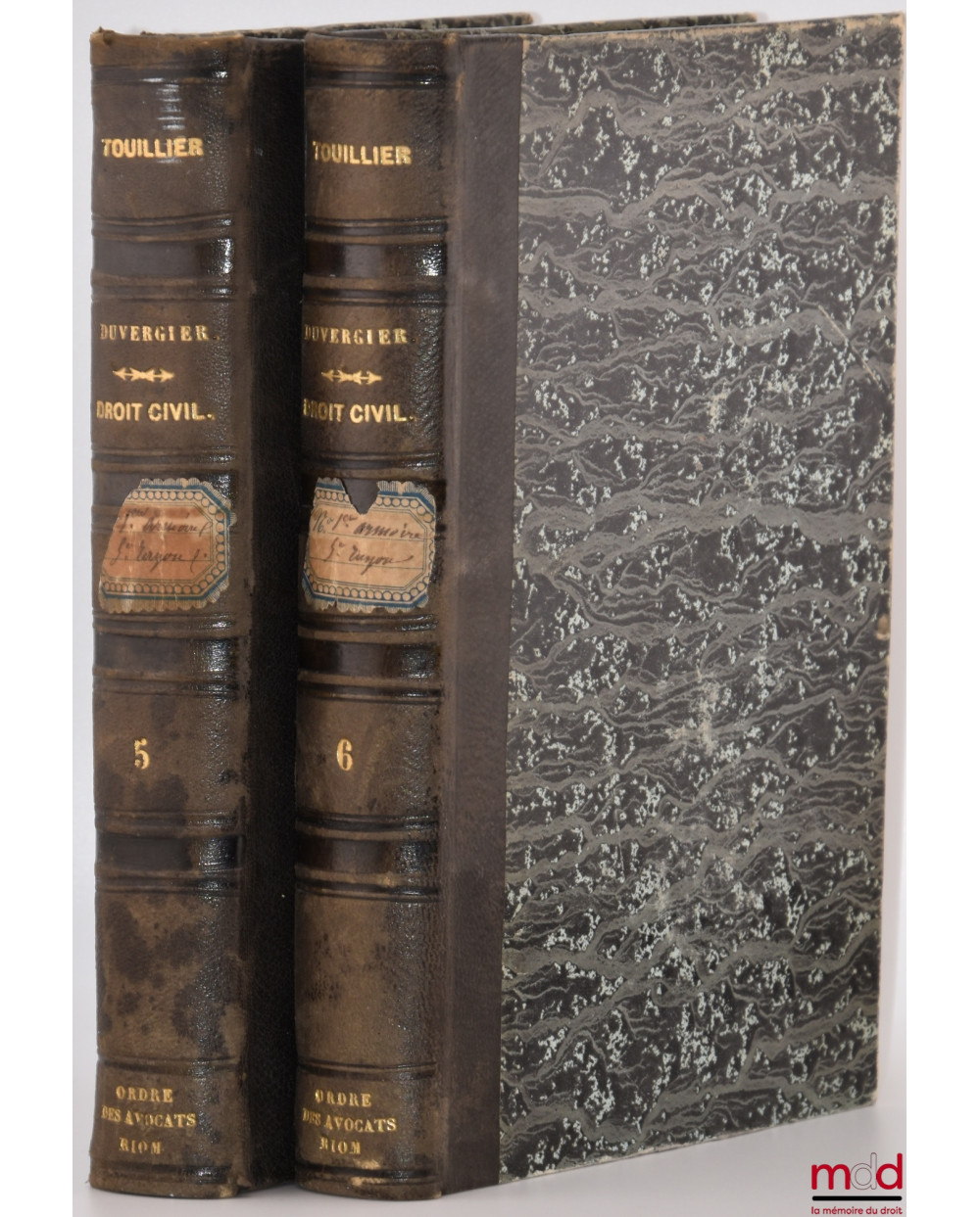 LE DROIT CIVIL FRANÇAIS SUIVANT L’ORDRE DU CODE, Ouvrage dans lequel on a taché de réunir la théorie à la pratique, Continué et complété par Duvergier, 6e éd., Comprenant : 1° Le texte des 14 volumes de M. Toullier, accompagné de notes par M. Duvergier ; 2° La continuation par M. Duvergier ; 3° Une table générale des matières., [V et VI uniquement]