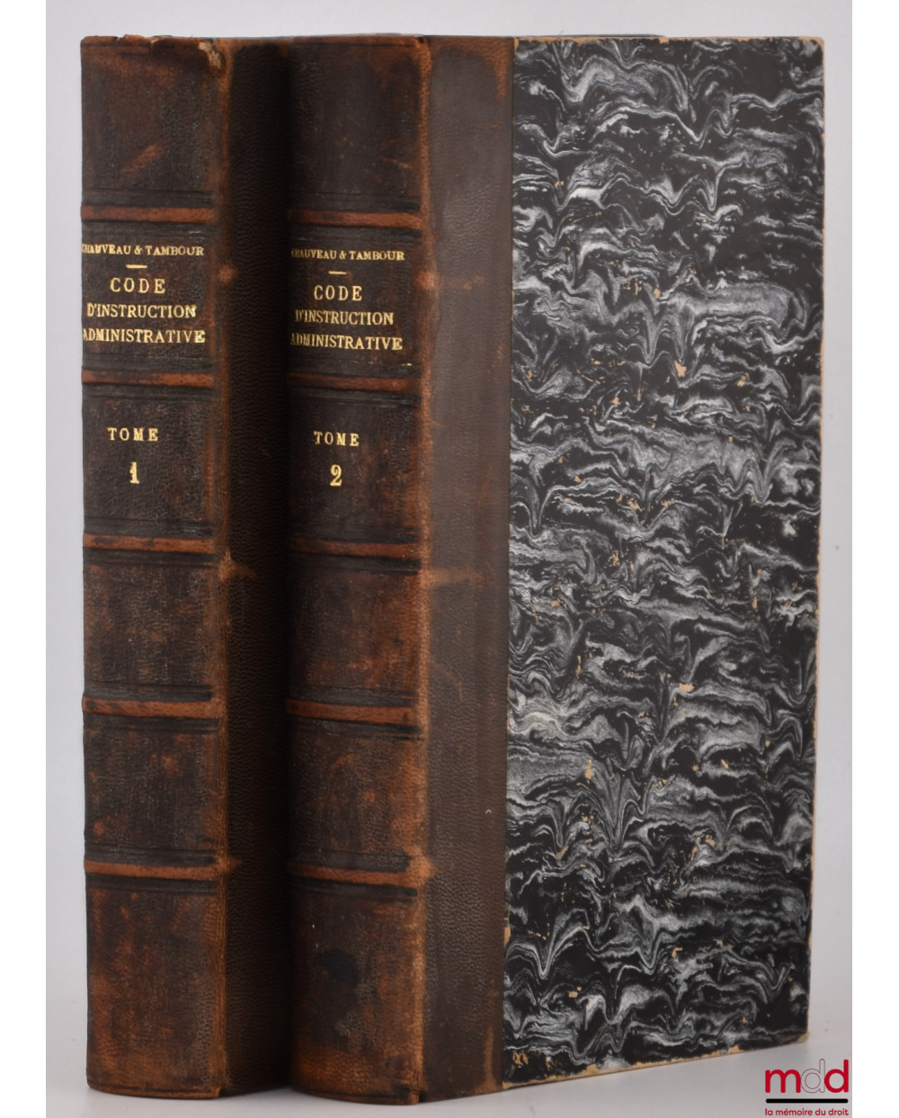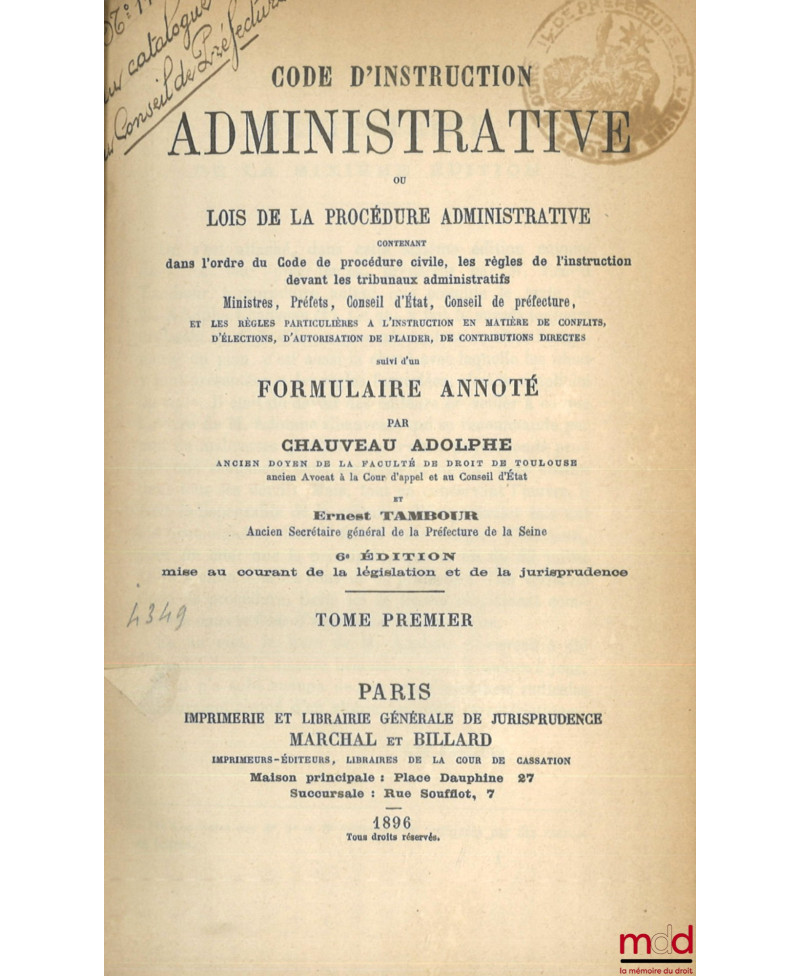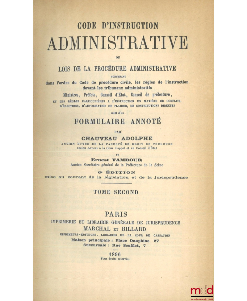 CODE D’INSTRUCTION ADMINISTRATIVE OU LOIS DE LA PROCÉDURE ADMINISTRATIVE contenant dans l’ordre du Code de procédure civile, les règles de l’instruction devant les tribunaux administratifs, Ministres, Préfets, Conseil d’État, Conseils de préfecture, et les règles particulières à l’instruction en matière de conflits, d’élections, d’autorisation de plaider, de contributions directes suivi d’un FORMULAIRE ANNOTÉ, 6e éd. mise au courant de la législation et de la jurisprudence