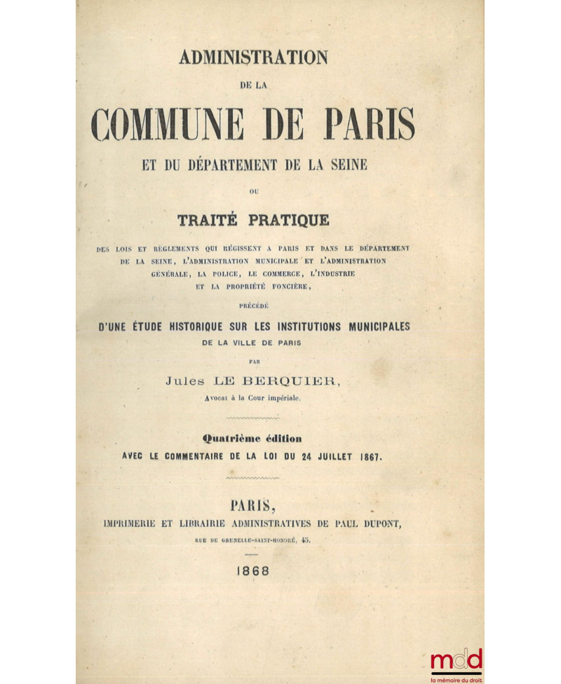 ADMINISTRATION DE LA COMMUNE DE PARIS ET DU DÉPARTEMENT DE LA SEINE ou Traité pratique des lois et règlements qui régissent à Paris et dans le département de la Seine, L’administration municipale et l’administration générale, La police, Le commerce, L’industrie et la propriété foncière, Précédé d’UNE ÉTUDE HISTORIQUE SUR LES INSTITUTIONS MUNICIPALES DE LA VILLE DE PARIS, 4e éd. avec le commentaire de la loi du 24 juillet 1867