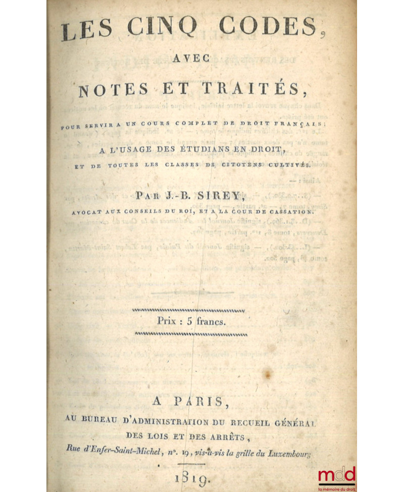 (Dupin n° 1375). Exceptionnel ouvrage qui est composé d’abord du texte complet des cinq grands codes et de la charte de 1814 mais surtout, dans sa 2e partie très substantielle, d’une dissertation intitulée « Du droit en général, de son essence et de son objet », d’un répertoire de notes de jurisprudence sur le cinq codes (classé par n° d’articles), d’une reprise de l’ouvrage publié par S. la même année « du Conseil d’État selon la charte constitutionnelle » et d’une étude de la procédure suivie devant la Cour de Cassation comprenant notamment les références de l’ensemble des arrêts rendus en matière de pourvoi en cassation par cette Cour jusqu’à la date d’édition. Ouvrage rare.
