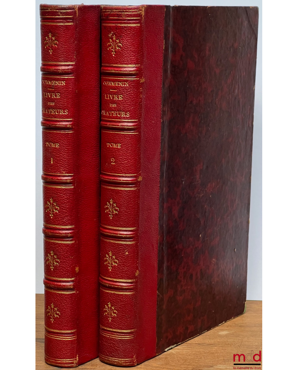 Le Baron de Cormenin, célèbre pour ses ouvrages de droit administratif qui en font un des fondateurs de la matière, était également un redoutable pamphlétaire sous le nom de Timon, doté d’une plume étincelante. Le présent exemplaire constitue l’édition définitive d’un de ses ouvrages les plus connus consacré à l’art oratoire et, spécialement à l’art oratoire parlementaire. Il débute par un traité de l’éloquence parlementaire, puis dans les autres genres (éloquence de la presse, didactique du pamphlet, éloquence du Barreau et du Parquet) parmi lesquels il faut particulièrement relever un chapitre que l’on ne retrouve dans aucun autre traité d’art oratoire : de l’Éloquence Délibérative du Conseil d’État du Premier Empire (dont l’auteur a fait partie). La suite de l’ouvrage est constituée d’une série de portraits des parlementaires les plus en vogue pendant la première partie du XIXème siècle (Benjamin Constant, Royer-Collard, Villêle, Ledru-Rollin, Lafayette, Odilon-Barrot, Arago, Lamartine, Thiers etc.). On y trouve en outre un certain nombre de petits pamphlets qui n’avaient pas été réédités jusqu’alors parmi lesquels on notera tout particulièrement “Statut du Nouvel Ordre Égalitaire” qui est une parodie de la doctrine fourriériste ainsi qu’un petit appendice sur les coups d’État extrêmement intéressant. Dernière édition.